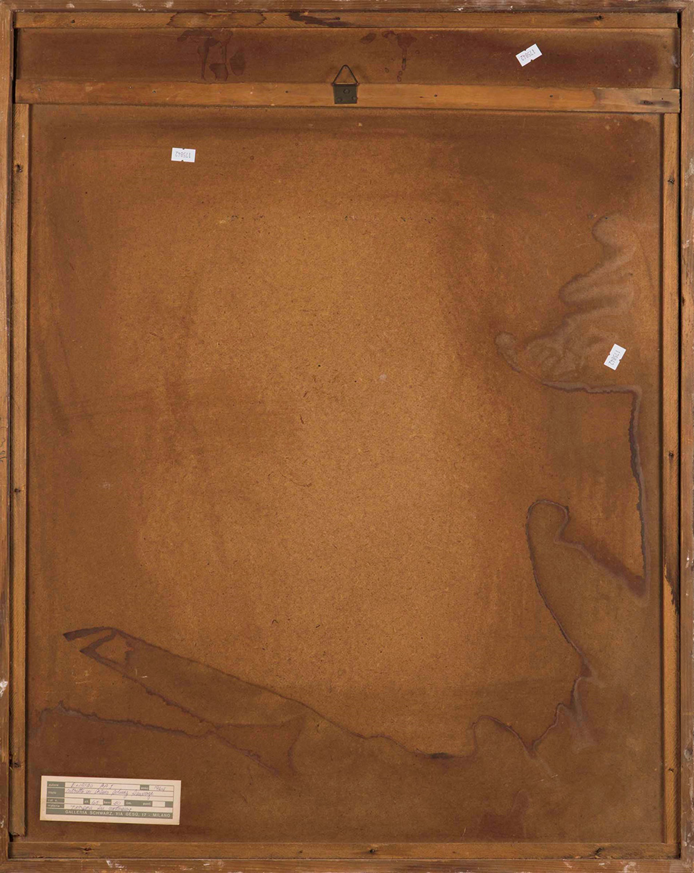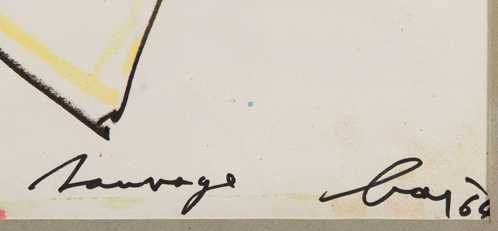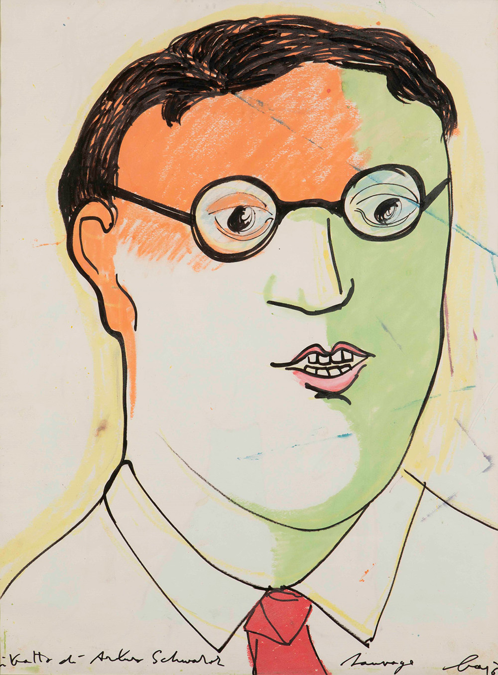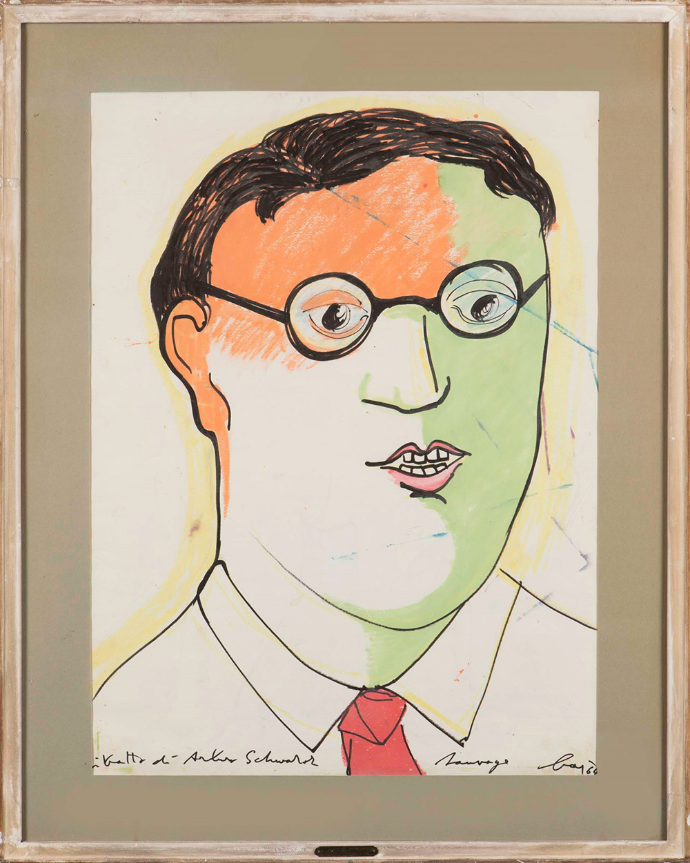 Enrico Baj (1924-2003) Ritratto di Arturo Schwarz, 1964 tempera su cartoncino, cm 65x50 firmato e datato in basso a destra e intitolato in basso a sinistra l'opera presenta ondulazioni della carta in prossimità dei bordi dovuto al pass Enrico Baj (1924-2003), Ritratto di Arturo Schwarz, 1964 tempere on cardboard, cm 65x50 signed and dated lower right and titled lower left