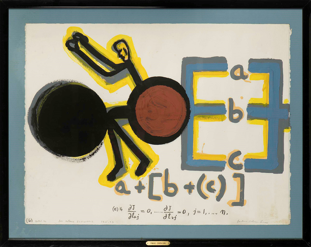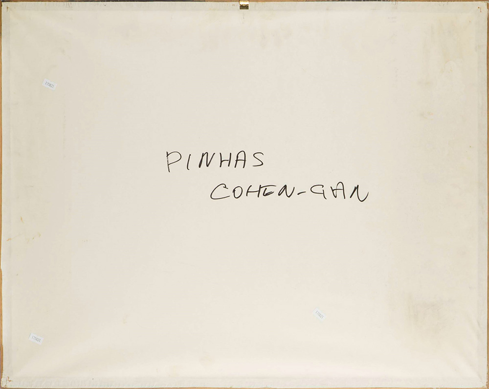 Pinchas Cohen Gan (1942) Senza titolo, 1992 tecnica mista su tela, cm 50x66 firmato in basso a destra, dedicato e datato in basso a sinistra firmato al retro l'opera presenta segni di scotch nell'angolo inferiore di destra Pinchas Cohen Gan (1942), Untitled, 1992 mixed media on canvas, cm 50x66 signed lower right, dedicated and dated lower left signed on the back