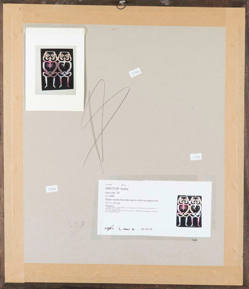 Andrè Breton (1896-1966) Senza titolo 20, 1950 ca decoupage di carta multicolore su cartoncino nero, cm 32,5x25 siglato al retro Bilbiografia: André Breton, Poésie et autre, un découpage della stessa serie è riprodotto sulla seconda di copertina Je vois, j'imagine, prefazione di Octavio Paz, ed. Gallimard, découpages della stessa serie sono riprodotti a p. 60 l'opera si presenta in buono stato conservativo Andrè Breton (1896-1966), Untitled 20, 1950 ca decoupage of multicolored paper on black cardboard, cm 32,5x25 signed on the back