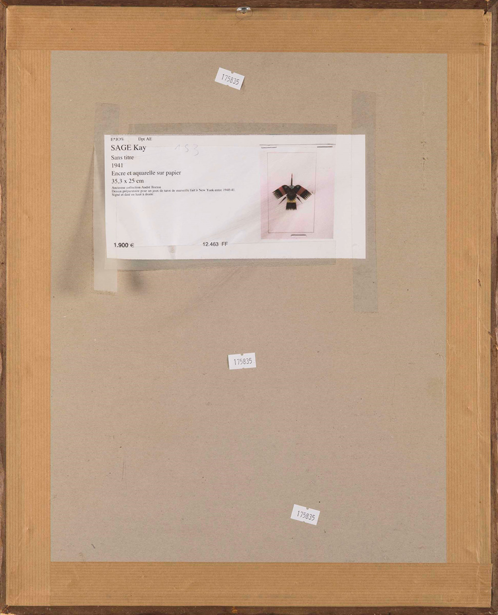 Kay Sage (1898-1963) Senza titolo, 1941 inchiostro su carta, cm 35,3x25 firmato e datato in alto a destra disegno preparatorio per il gioco dei Tarocchi di Marsiglia, New York, 1940-1941 Provenienza: Collezione Andrè Breton Kay Sage (1898-1963), Untitled, 1941 ink on paper, cm 35,3x25 signed and dated upper left drawing for the Tarocchi game Marsiglia, New York, 1940-1941