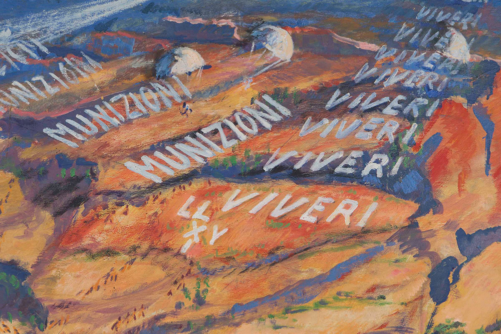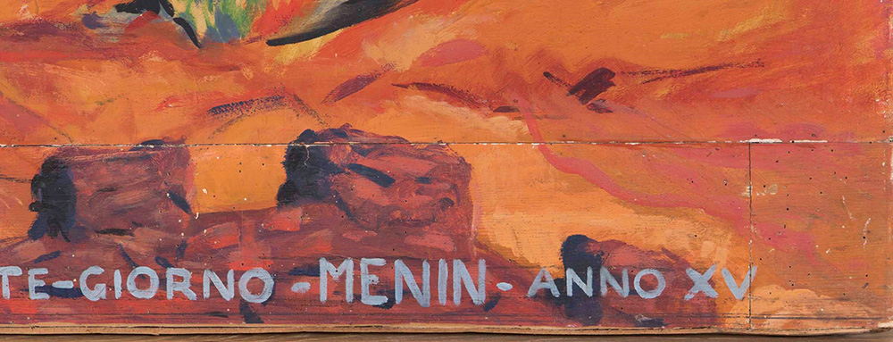Mario Menin (1896-1961) Simultaneità di marcie di notte-giorno nel Tembien, 1936 olio su tavola, cm 183x224,5 firmato, intitolato e datato in basso a destra Provenienza: Collezione Marinetti Collezione privata, Milano Esposizioni: Quadriennale di Roma, 1939 Futurismo I gruppi futuristi Boccioni e Savarè, a cura di B. Buscaroli, Fabbri e A. Ortenzi, presso Lamec, Vicenza, 1999 Bibliografia: Mario Menin, Camicia Nera Futurista e primo battaglista del mondo, Edizioni Futuriste di Poesia, Roma, 1941 l’opera presenta piccoli buchi dovuti ai tarli nella parte di fascia superiore ed inferiore. presenta una patina di sporco sulla superficie. Mario Menin (1896-1961), Simultaneità di marcie di notte-giorno nel Tembien, 1936 oil on board, cm 183x224,5 signed, titled and dated lower right