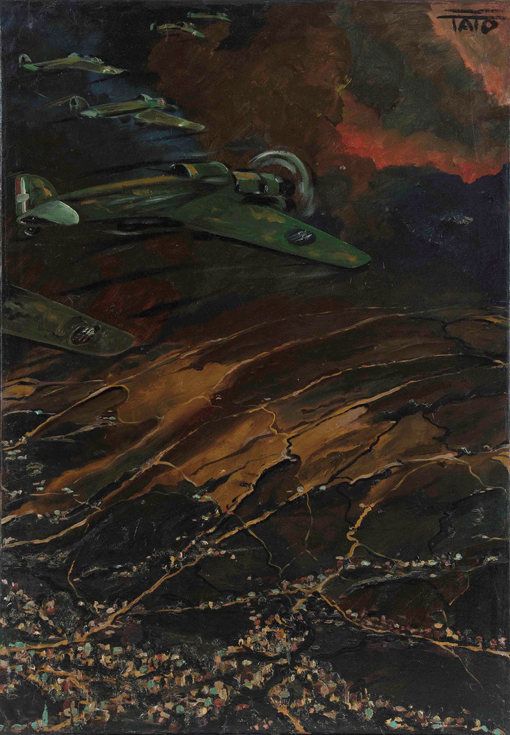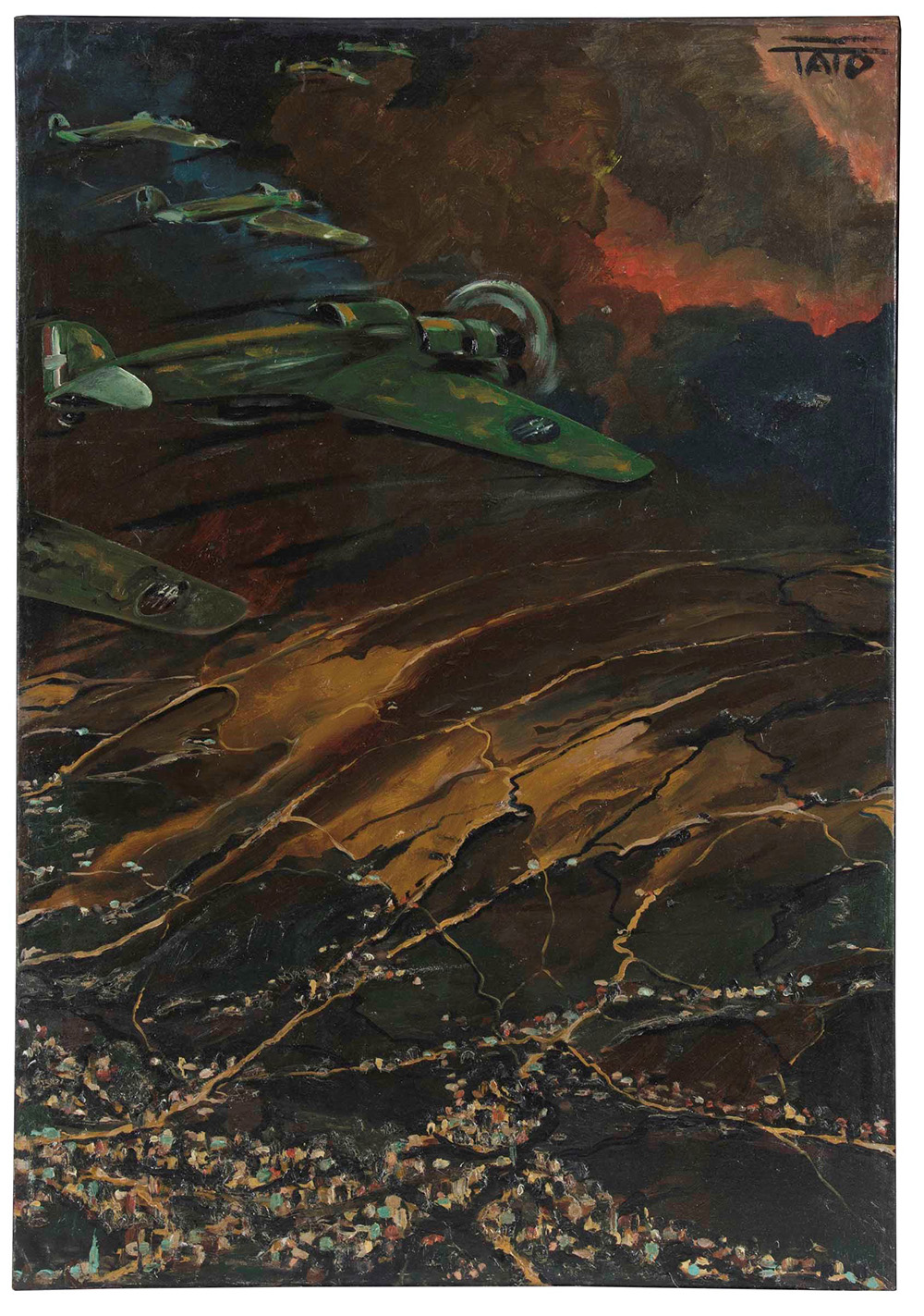 Guglielmo Sansoni (1896-1974) detto Tato Sparvieri in azione, 1940 olio su tela, cm 100x70 firmato in alto a destra intitolato al retro Provenienza: Collezione privata, Roma Esposizioni: Tato. Mostra personale di aeropitture futuriste di guerra. OND Ministero Aeronautica, Roma, 1941 Tato futurista. Cinquanta aeropitture in mostra nel centenario della SIAI Marchetti, a cura di Salvatore Ventura, Palazzo Comunale, Sesto Calende, 13 giugno - 19 luglio 2015 Bibliografia: Tato. Mostra personale di aeropitture futuriste di guerra. OND Ministero Aeronautica, Roma, 1941, ill. in bianco e nero