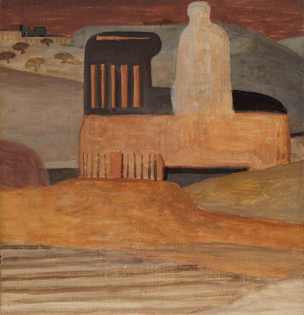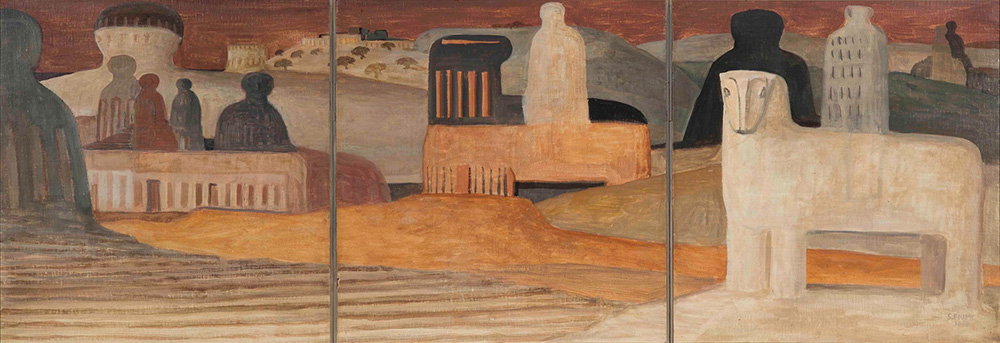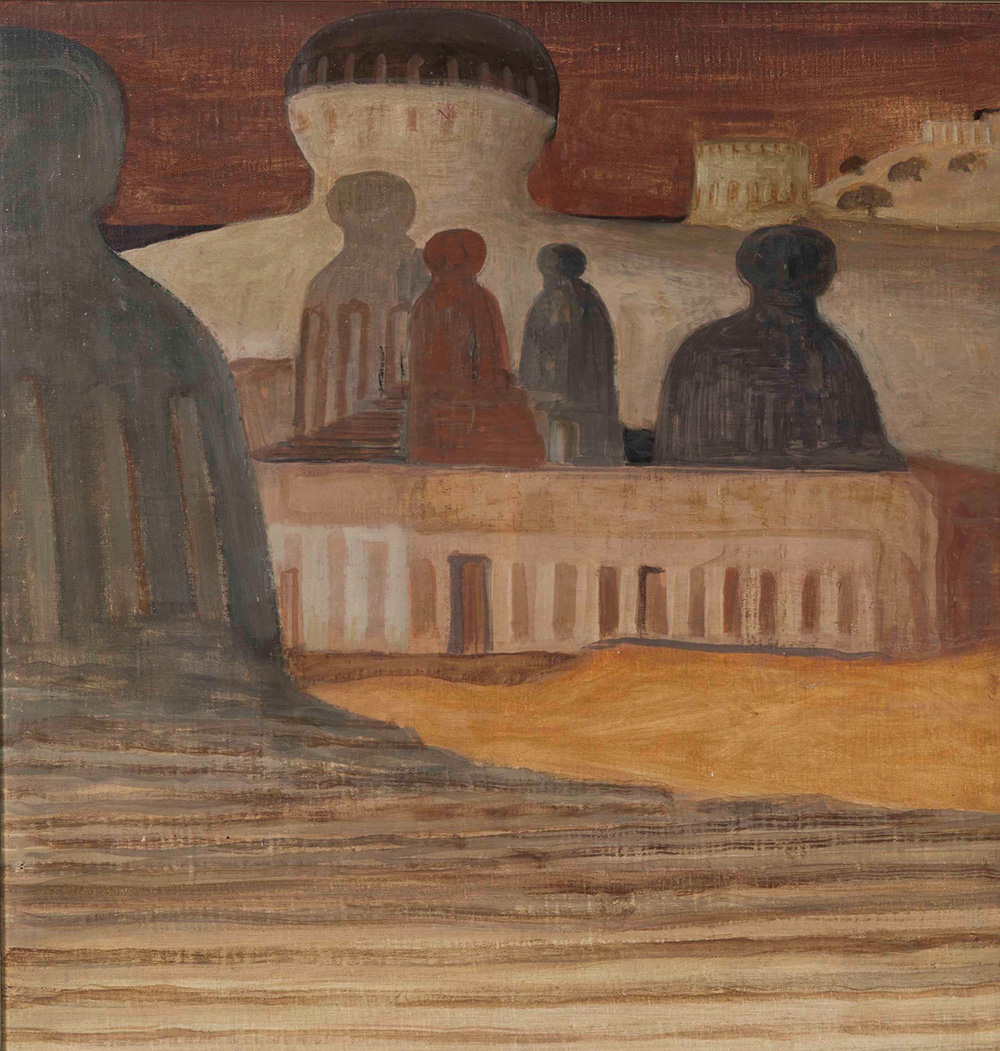Salvatore Fiume (1915-1997) Isola di statue, 1953 olio su tavola, cm 47x136...