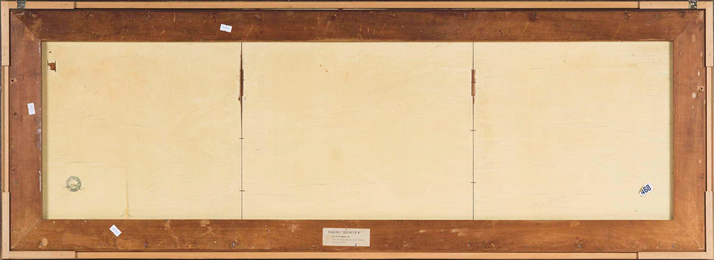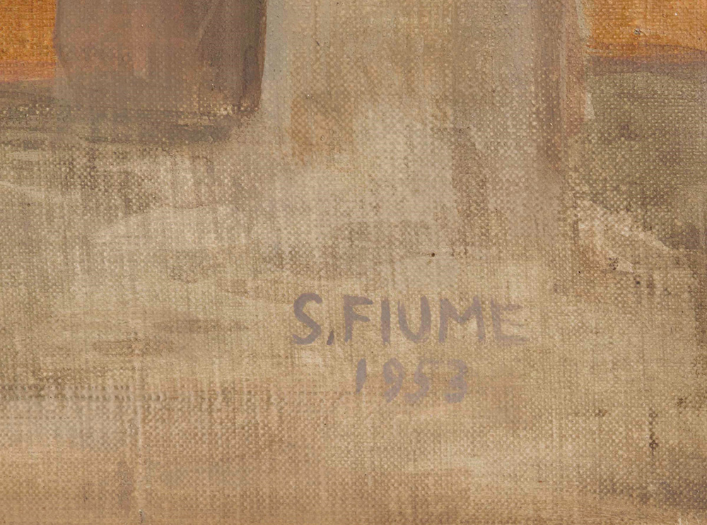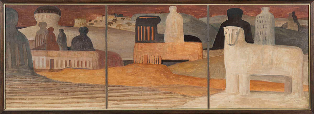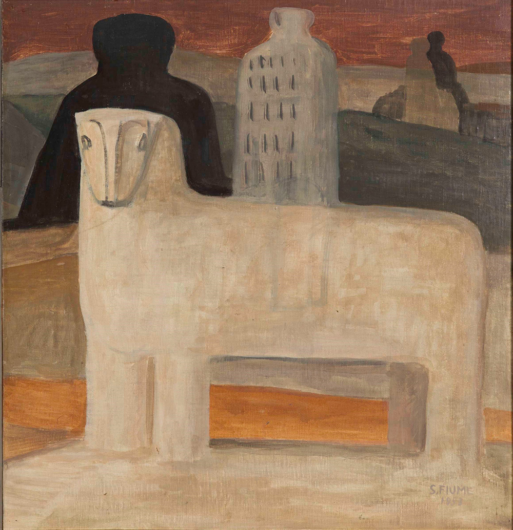 Salvatore Fiume (1915-1997) Isola di statue, 1953 olio su tavola, cm 47x136 firmato e datato in basso a destra Autentica su fotografia dell'artista Provenienza: Galleria La Cornice, Parma, ivi acquistato dall’attuale proprietario l'opera presenta un'abrasione nella parte centrale in corrispondenza del bordo (dove si unisce la prima tavola alla seconda) Salvatore Fiume (1915-1997), Isola di statue, 1953 oil on board, cm 47x136 signed and dated lower right Photo certificate signed by the artist
