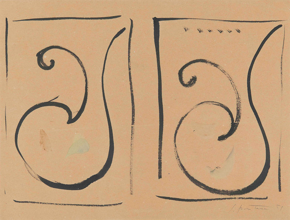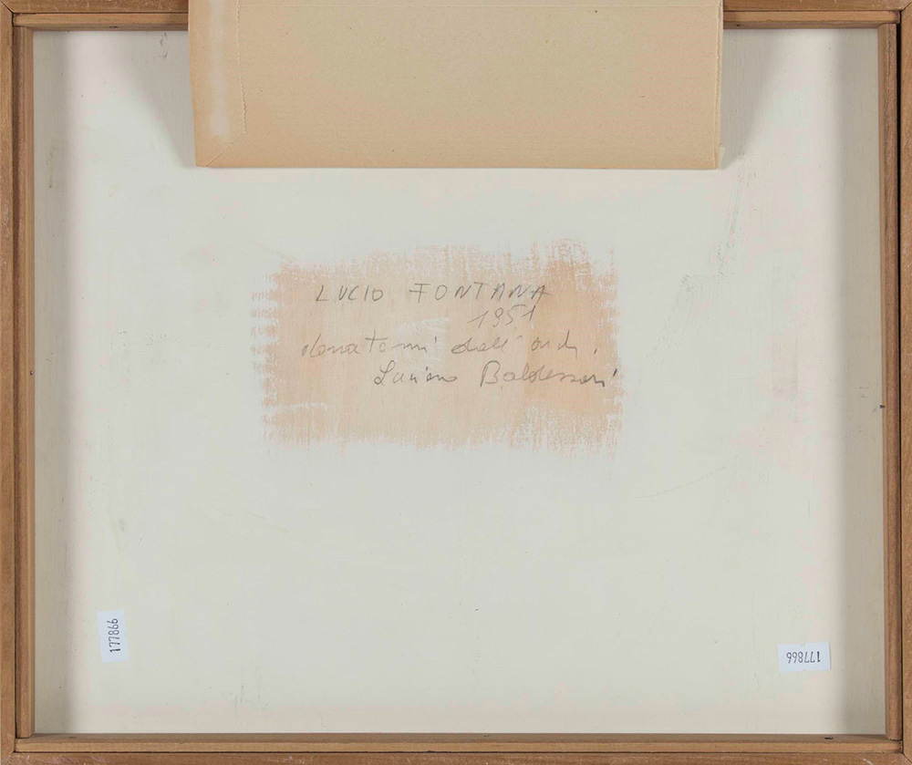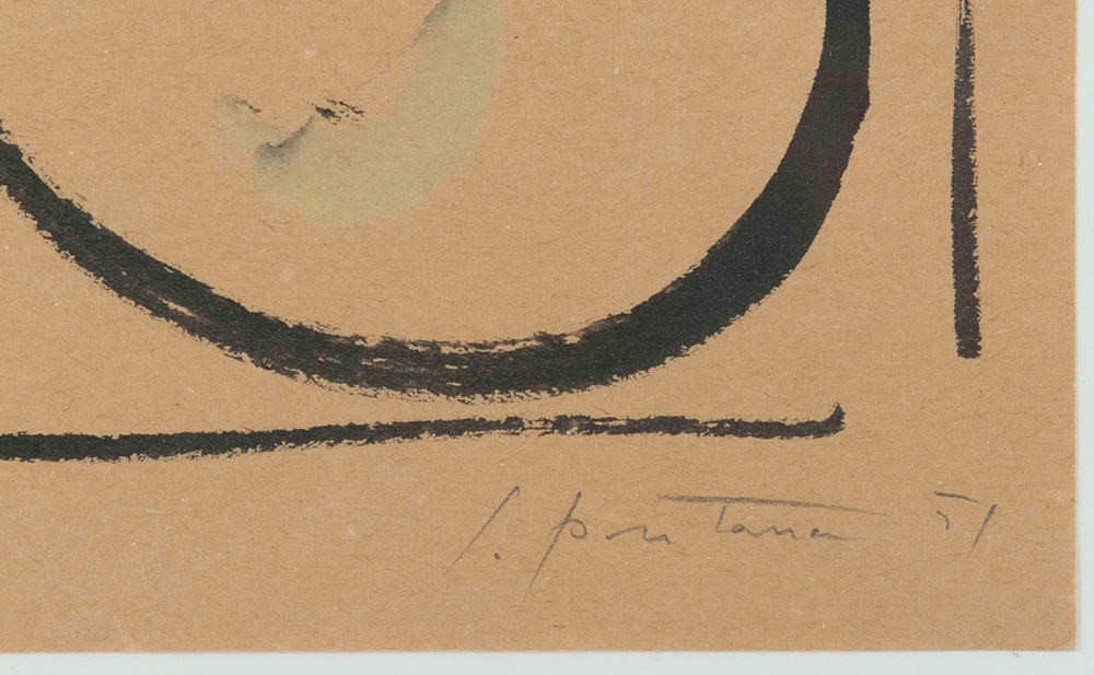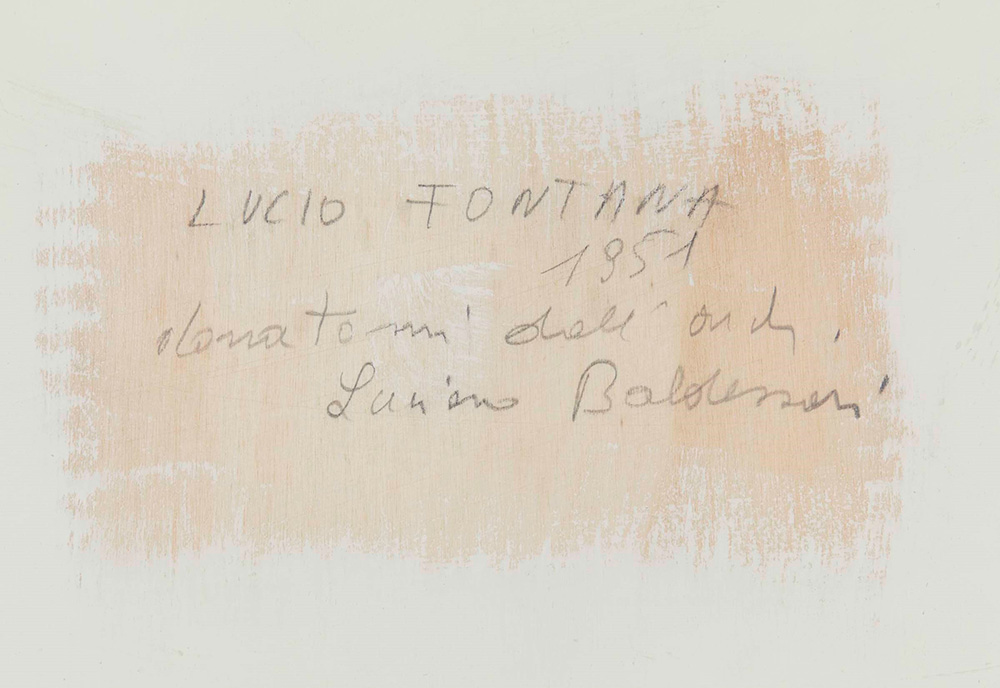 Lucio Fontana (1899-1968) Due studi per Manifesto IX Triennale di Milano, 1951 china e acquerello su carta, cm 22x28,5 firmato e datato in basso a destra Opera registrata presso l’Archivio Lucio Fontana, Milano, con il n. 2946/1 Provenienza: Collezione Architetto Luciano Baldessari, donato all’attuale proprietario l'opera presenta una piega lungo tutta la superificie Lucio Fontana (1899-1968), Due studi per Manifesto IX Triennale di Milano, 1951 india ink and watercolor on paper, cm 22x28,5 signed and dated lower right This work is registered at the Archivio Lucio Fontana, Milano, with the n. 2946/1