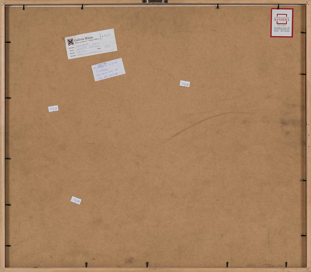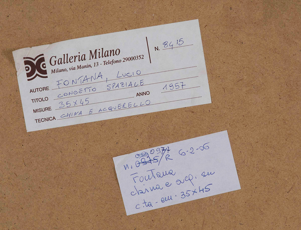 Lucio Fontana (1899-1968) Concetto spaziale, 1957 chine colorate e acquerello su carta, cm 35x44 firmato e datato in basso a destra Etichetta al retro della Galleria Milano, Milano Etichetta al retro della Fondazione Bandera, Busto Arsizio Opera registrata presso l'Archivio Lucio Fontana, Milano, con il n. 229 Provenienza: Collezione privata, Milano l’opera presenta residui di colla sul bordo, gora di umidità in basso e sul bordo di destra, ondulazione della carta dovuta al montaggio. Lucio Fontana (1899-1968), Concetto spaziale, 1957 colored india ink and watercolor on paper, cm 35x44 signed and dated lower right Label on the back of Galleria Milano, Milano Label on the back of the Fondazione Bandera, Busto Arsizio This work is registered at the Archivio Lucio Fontana, Milano, with the number n. 229