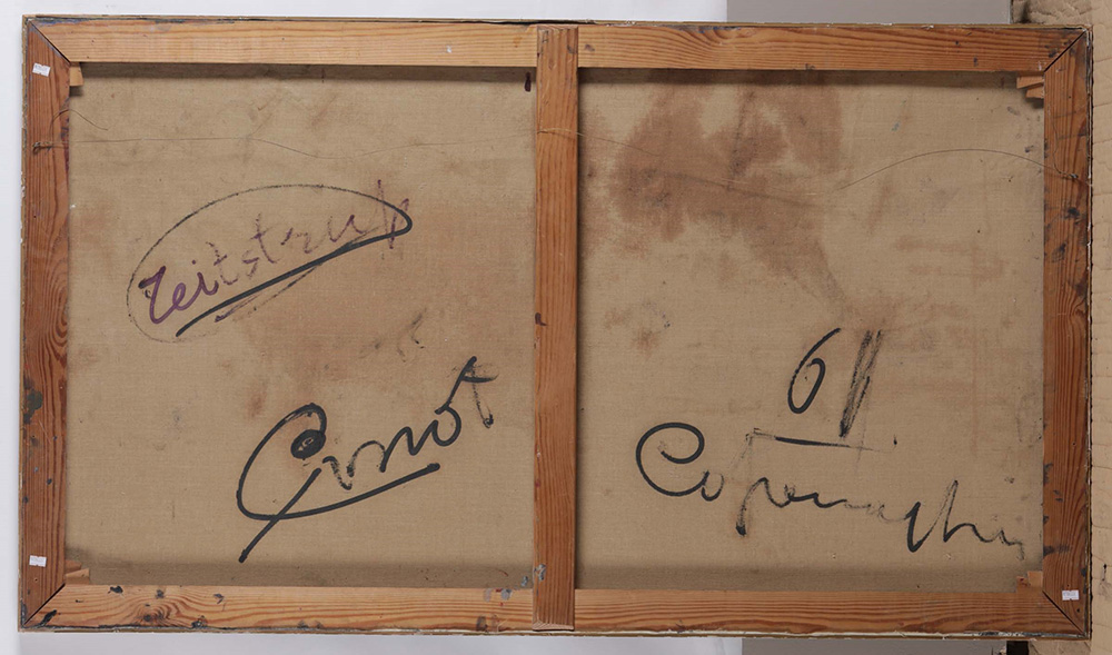 Pinot Gallizio (1902-1964) Zeitstrup, 1961 olio su tela, cm 80x140 firmato, intitolato e datato al retro Provenienza: Galleria Birch, Copenhagen Collezione privata, Italia Esposizioni: Il cielo dei vichinghi, Teatro Monviso, Cuneo, 1 giugno-20 luglio 1984 Bibliografia: Il cielo dei vichinghi. Teatro Monviso, Cuneo, 1 giugno-20 luglio 1984, Institute of Actual Art, 1984 Pinot Gallizio. Catalogo generale delle opere 1953-1964, a cura di Maria Teresa Roberto, Ed. Gabriele Mazzotta, 2001, p. 200 allentamento della tela nell’angolo superiore sinistro, patina di sporco facilmente rimovibile. mancanza di colore lungo il bordo di destra di cm 1 ed in corrispondenza della cornice a destra Pinot Gallizio (1902-1964), Zeitstrup, 1961 oil on canvas, cm 80x140 signed, titled and dated on the back
