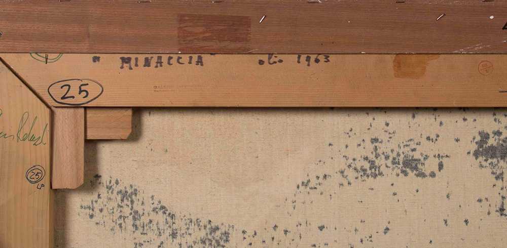 Giuseppe Santomaso (1907-1990) Minaccia, 1963 olio su tela, cm 162x130 firmato e datato in basso a sinistra intitolato e datato al retro Etichetta al retro della Galerie Im Erker, San Gallo (Svizzera) Opera registrata presso l’Archivio Giuseppe Santomaso, a cura della Galleria Blu, Milano, con il n. SOT/1010 Esposizioni: Santomaso, Galerie Im Erker, San Gallo (Svizzera), febbraio - marzo 1964 Bibliografia: Santomaso, Galerie Im Erker, San Gallo (Svizzera), 1964, n.12, p. 21 (tav. VIII) Santomaso, Catalogue raisonné. 1931-1974, a cura di L. Alfieri, Alfieri Editore, Venezia, 1975, ill. n. 442 Santomaso. Catalogo ragionato, a cura di Nico Stringa, Allemandi Editore, Torino, 2017, vol.I, tav. 135, ill. a colori a piena pagina Santomaso. Catalogo ragionato, a cura di Nico Stringa, Allemandi Editore, Torino, 2017, vol.II, pag.124, numero 545, ill. in bianco e nero buone condizioni Giuseppe Santomaso (1907-1990), Minaccia, 1963 oil on canvas, cm 162x130 signed and dated lower left titled and dated at the back Label of Galerie Im Erker, St. Gallen (Switzerland) on the back This work is registered at the Giuseppe Santomaso Archive, curated by Galleria Blu, Milano, with the n. SOT/1010