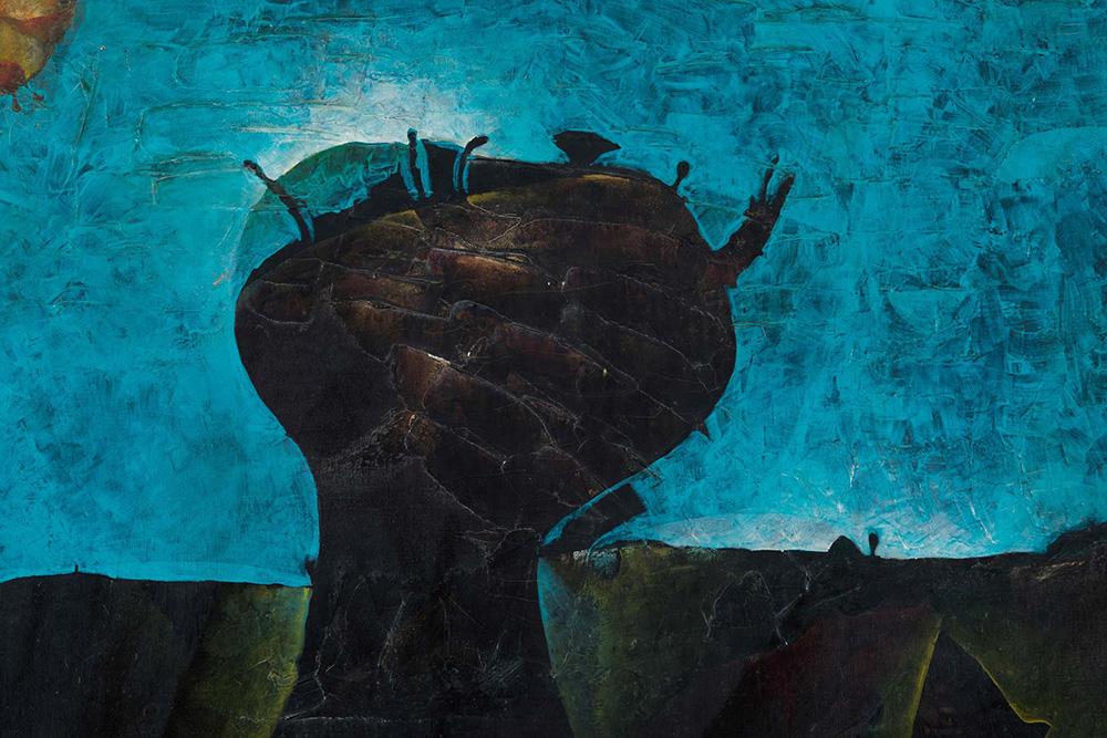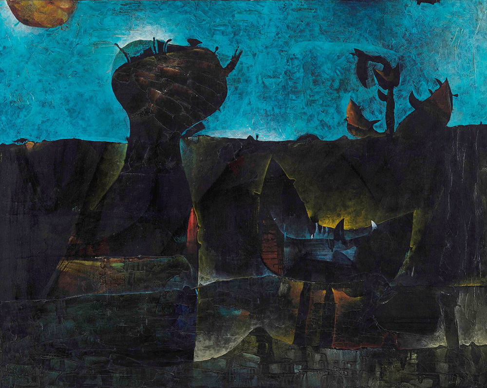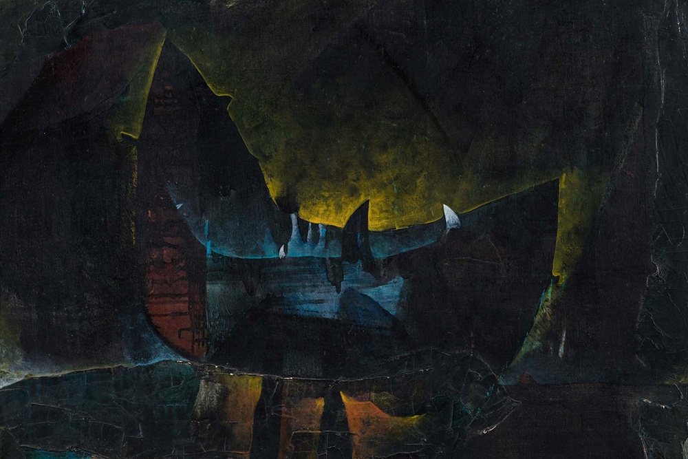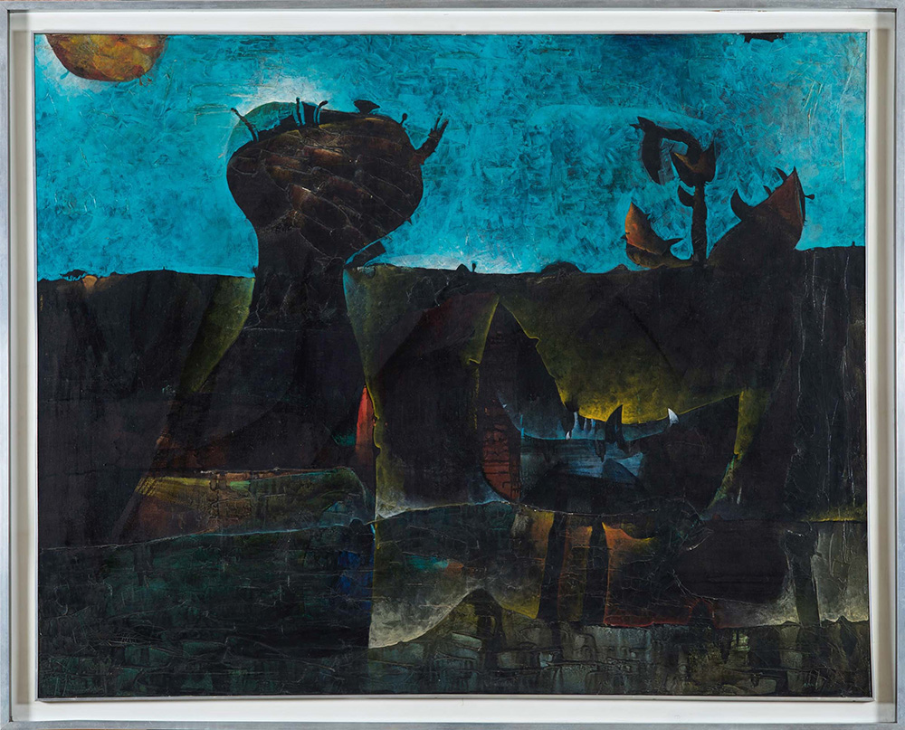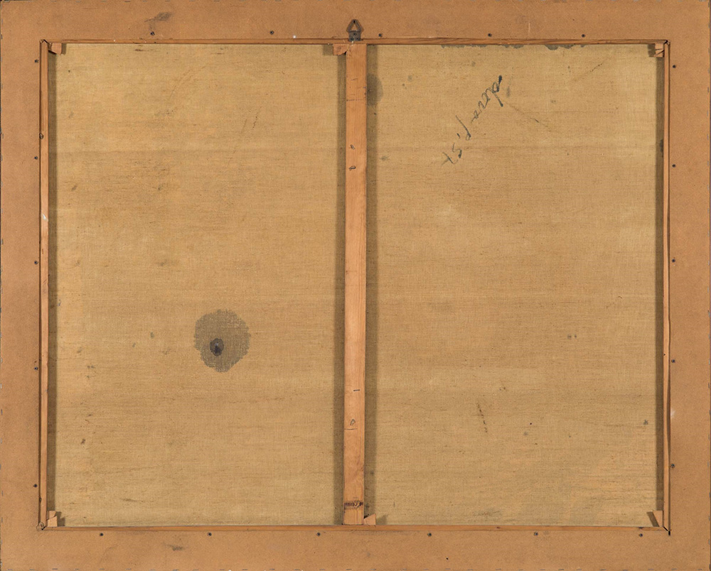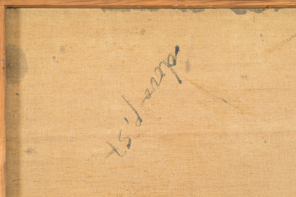 Gianni Dova (1925-1991) Senza Titolo, 1957 olio su tela, cm 114x146 firmato e datato in basso a destra firmato e datato al retro Esposizioni: Mostra personale di Gianni Dova, Palazzo Reale di Milano, 1971-72, allestita nella Sala delle Cariatidi l’opera presenta craquelure sulla superficie, soprattutto dov’è materico. piccolissime mancanze e sbeccature, in corrispondenza delle pennellate più spesse presenta mancanze di colore (più evidenti verso il basso e nella parte centrale in alto) Gianni Dova (1925-1991), Untitled, 1957 oil on canvas, cm 114x146 signed and dated lower right signed at the centre