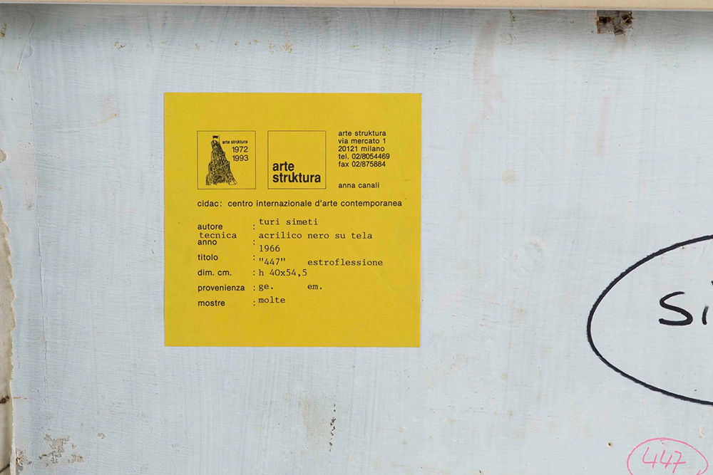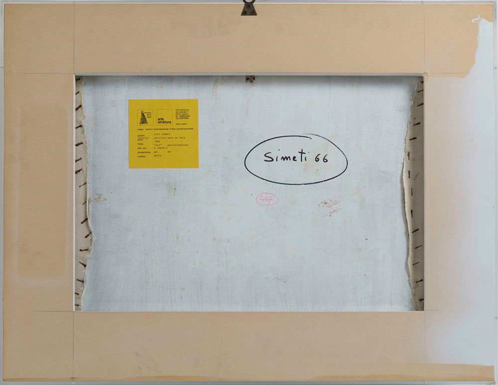 Turi Simeti (1929) Un ovale nero, 1966 acrilico su tela sagomata, cm 40x54,5 Etichetta al retro del Centro culturale Arte Struktura, Milano Opera registrata presso l’Archivio Turi Simeti, Milano, con il n.1966-N0401 Provenienza: Centro culturale Arte Struktura, Milano Collezione privata, Magenta Bibliografia: Catalogo ragionato. Turi Simeti, a cura di Antonio Addamiano e Federico Sardella, Skira Editore, Milano, 2017, tomo II, p. 531, n. 174 lieve sfregamento in alto a sinistra di circa 1 cm, lieve patina di polvere sulla superficie Turi Simeti (1929), Un ovale nero, 1966 acrylic on shaped canvas, cm 40x54,5 Centro culturale Arte Struktura, Milano labelled at the back This work is registered at the Turi Simeri Archive, Milan with the number 1966-N0401
