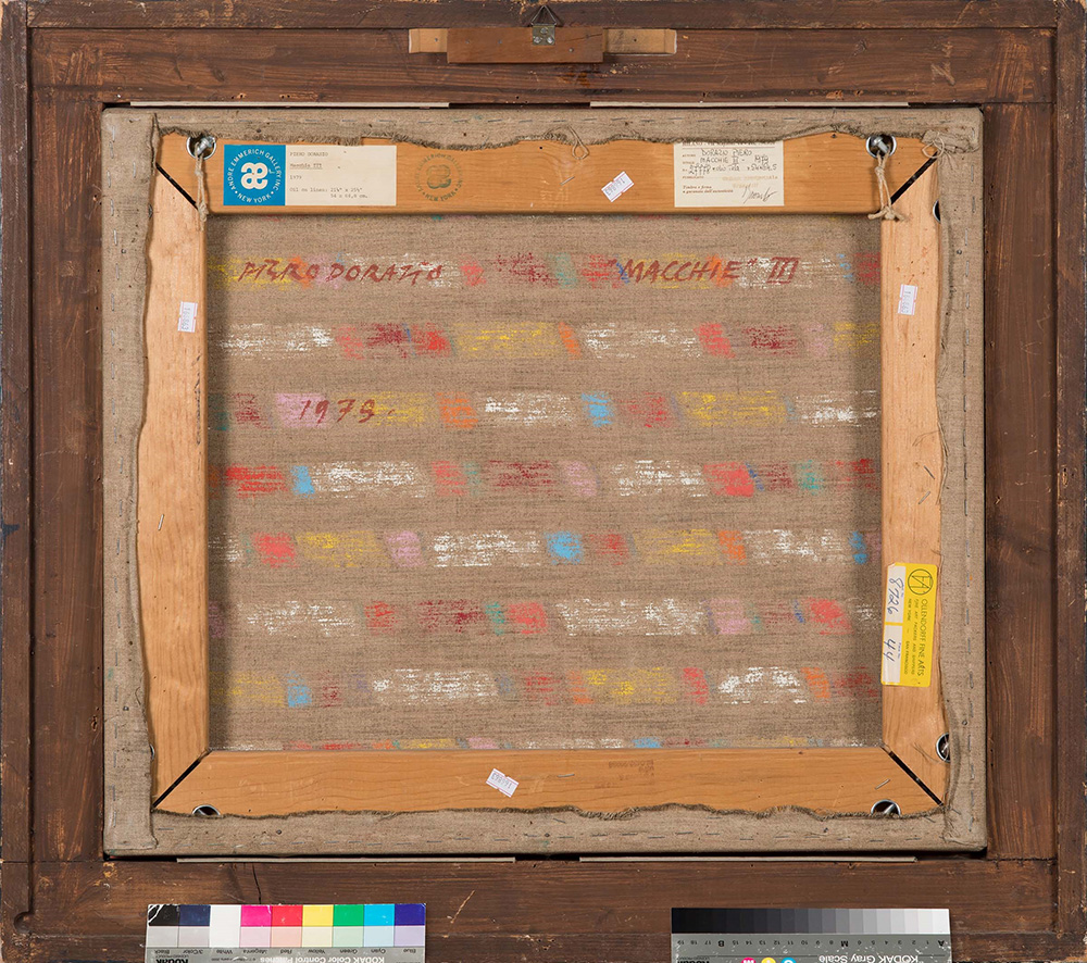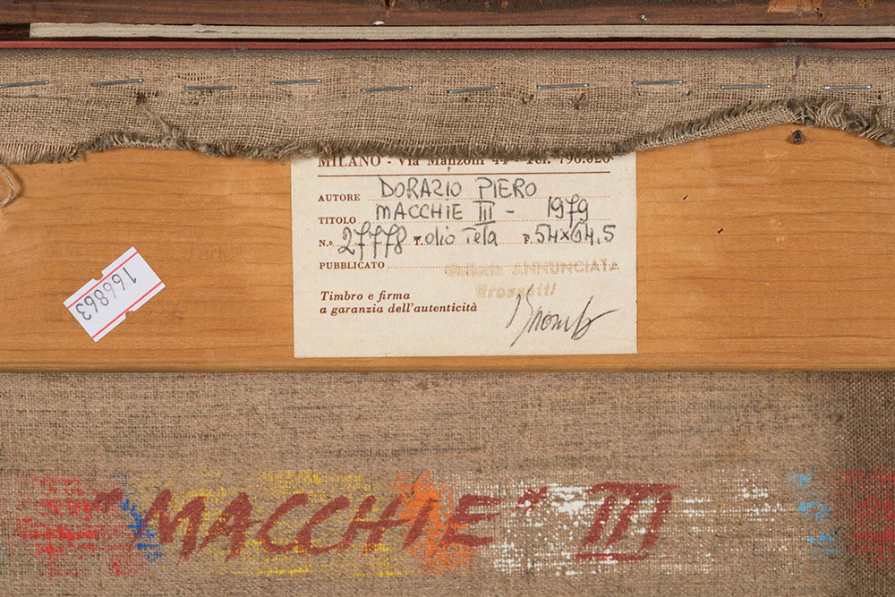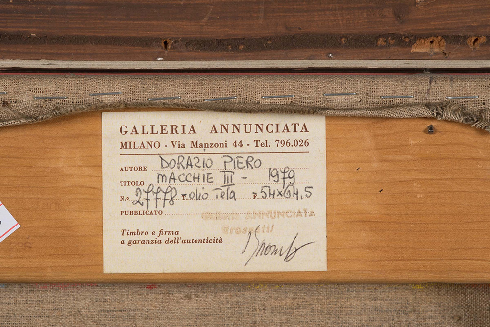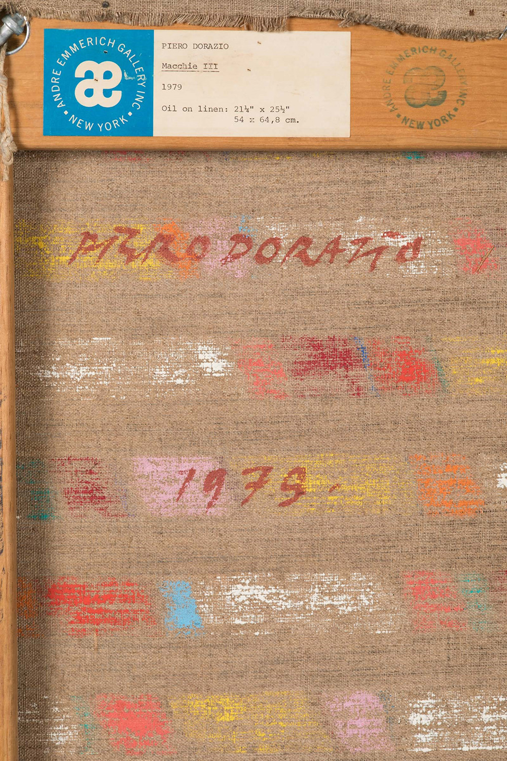Piero Dorazio (1927-2005) Macchie III, 1979 olio su tela, cm 54x64,5 firmato e intitolato al retro Etichetta al retro della Galleria Annunciata, Milano Timbro ed etichetta al retro della Andre Emmerich Gallery INC, New York Opera in fase di archiviazione presso l'Archivio Piero Dorazio, Milano Provenienza: Galleria Mara Coccia Arte Contemporanea, Roma, ivi acquistato dall'attuale proprietario Galleria Annunciata, Milano buono stato di conservazione Piero Dorazio (1927-2005), Macchie III, 1979 Oil on canvas cm 54x64,5 Label on back of Galleria Annunciata, Milano Label and stamp of Andre Emmerich Gallery INC, New York