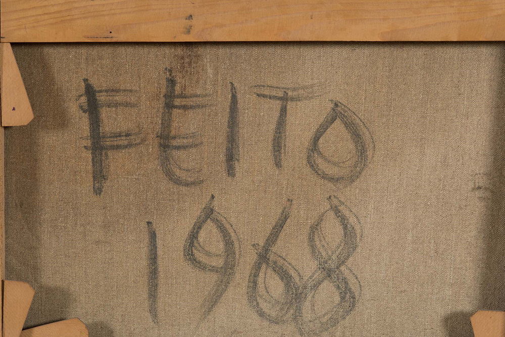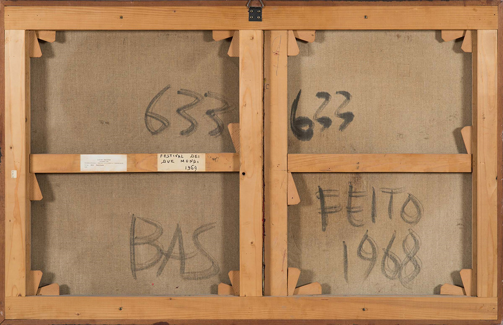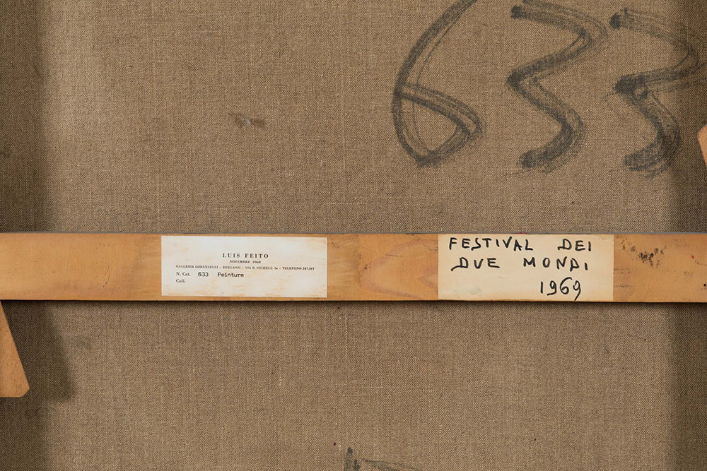 Luis Feito (1929) Senza titolo, 1968 olio su tela, cm 72x115 firmato e datato al retro Etichetta al retro della Galleria Lorenzelli, Bergamo Provenienza: Galleria Lorenzelli, Bergamo Collezione privata, Varese Esposizione: Luis Feito, novembre 1968. Galleria Lorenzelli, Bergamo, come da etichetta al retro che riporta il numero "kat.633" Festival dei due mondi, Spoleto, 1969 l'opera presenta craquelure su tutta la superficie, patina di sporco Luis Feito (1929), Untitled, 1968 oil on canvas, cm 72x115 signed and dated on the back Label of Galleria Lorenzelli, Bergamo on the back