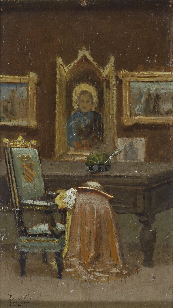 Francesco Gioli (San Frediano a Settimo, 1846 - Firenze, 1922) Preghiera, Anni '70 Olio su tavola, cm. 18,3x10,2 Firma in basso a sinistra.