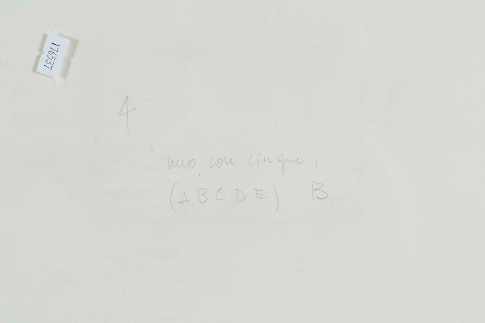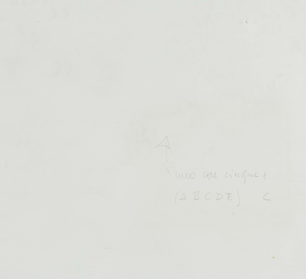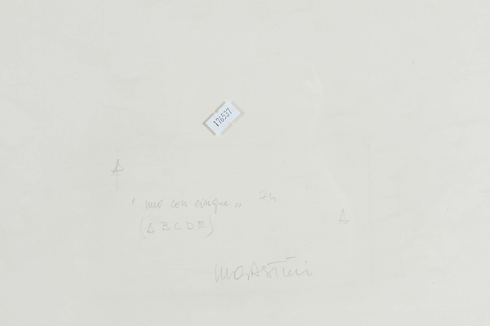 Marco Gastini (1938) Uno con cinque, 1974 acrilico, contè e pastello su carta, cm 70x503 Opera composta da 5 elementi intitolato, datato e firmato al retro Timbro al retro di Carlo Grossetti Salone Annunciata, Milano Opera registrata presso l’Archivio Marco Gastini, Torino, con il n. 1974/117 n. 0009, in data 11/04/2018 Provenienza: Carlo Grossetti Salone Annunciata, Milano Collezione privata presentano segni di muffa-ruggine, si consiglia pulitura. nell’insieme non si nota. Marco Gastini (1938), One with five, 1974 acrylic, contè and crayon on paper, cm 70x503 This work is composed by 5 elements titled, signed and dated on the back Label of Salone Annunciata, Milano on the back This work is registered at the Marco Gastini Archive, Turin with the n. 1974/117 n. 0009, 11/04/2018