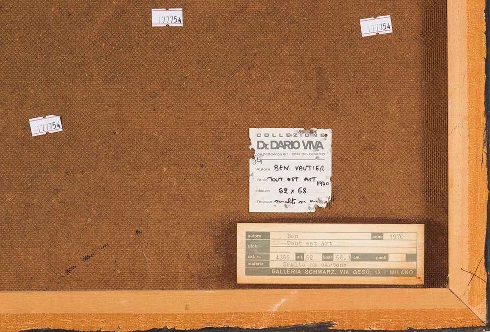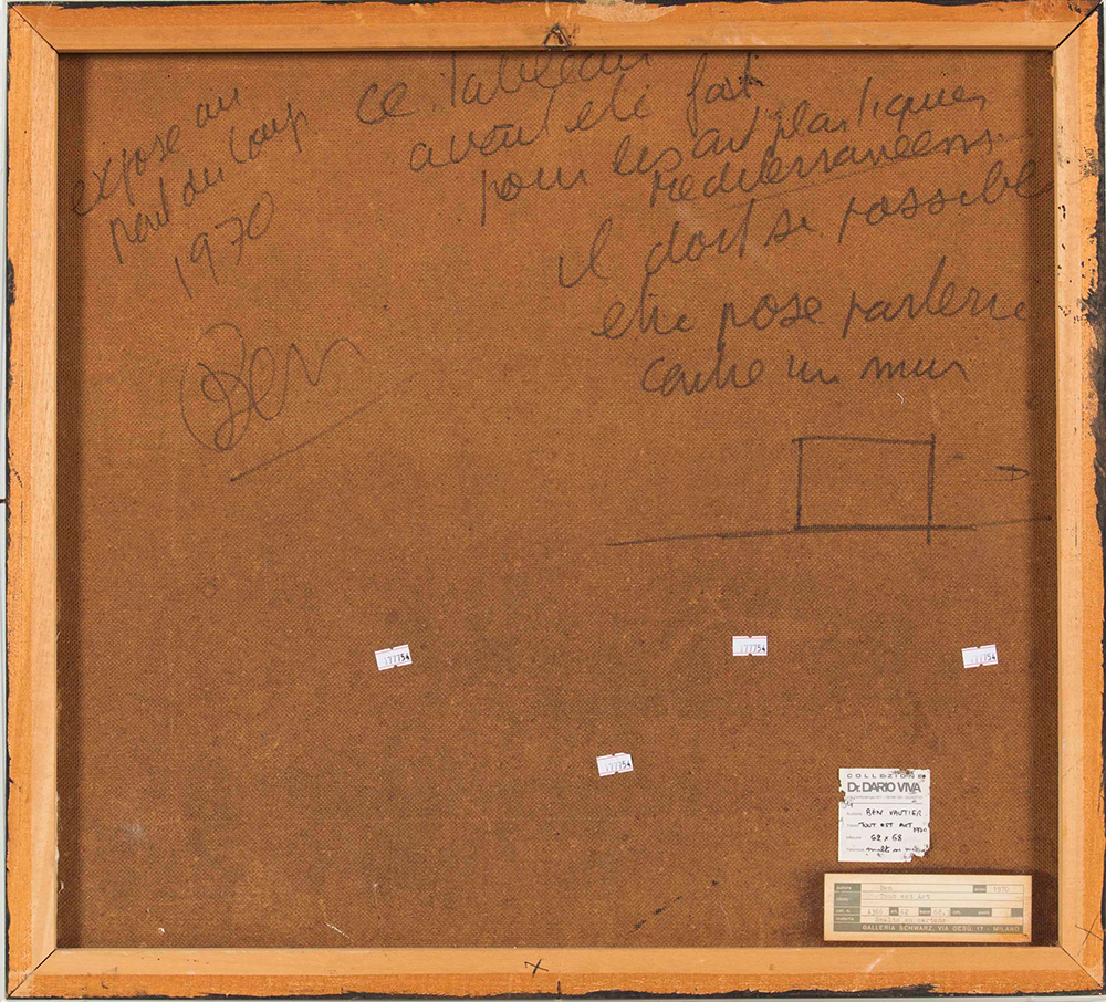 Benjamin Vautier (1935) Tout est art, 1970 olio e tecnica mista su tavola, cm 62x68,3 datato e firmato al retro Etichetta al retro della Galleria Arturo Schwarz, Milano errata corrige: su masonite angolo in basso a destra sollevamento del cartone con intervento del restauro, lievi interventi lunghi i bordi, riprese di colore nero Benjamin Vautier (1935), Tout est art, 1970 Oil and mixed technique on Canvas, cm 62x68,3 Label of Galleria Arturo Schwarz on back Signature on the back