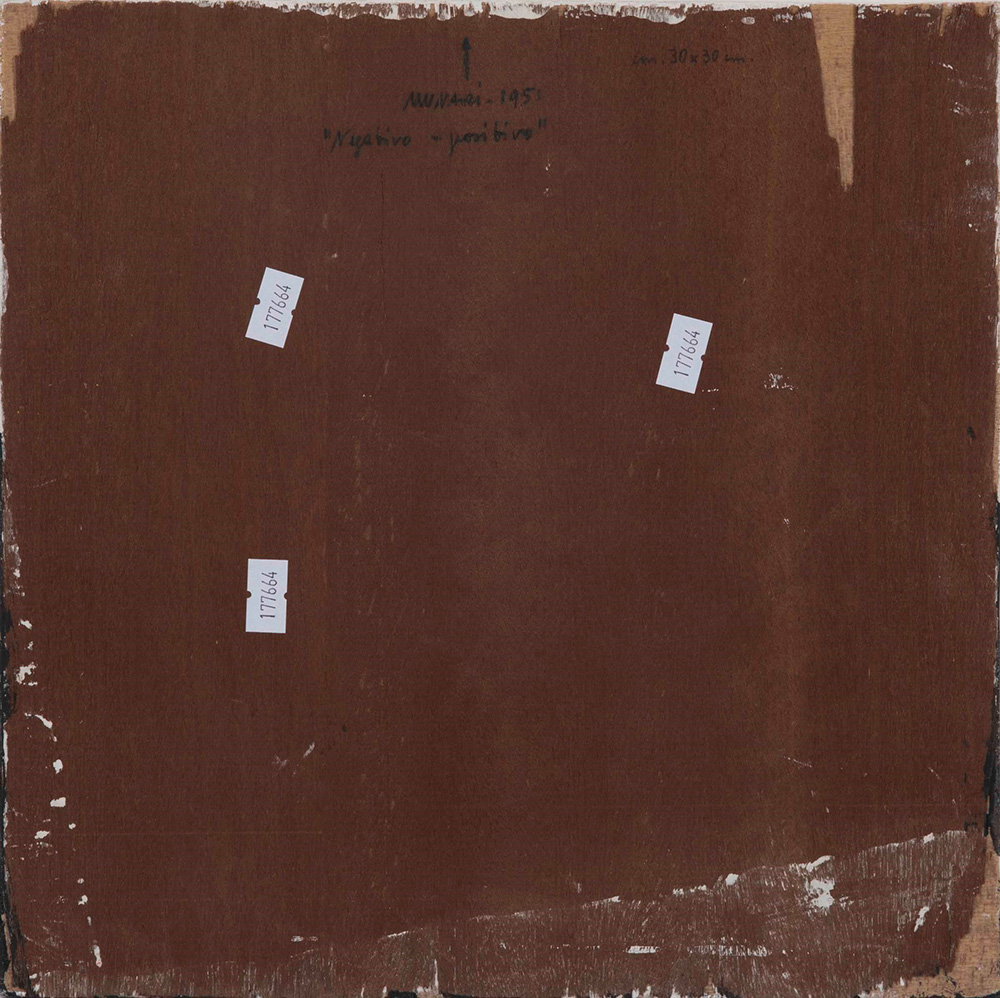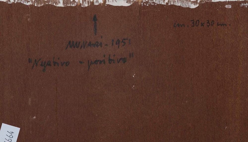 Bruno Munari (1907-1998) Negativo e positivo, 1951 pittura a tempera su pannello di compensato, cm 30x30 firmato, intitolato e datato al retro Autentica a cura di Alberto Munari in data 20 marzo 2018 l'opera presenta alcuni graffi sulla superficie nera, nell'angolo superiore di sinistra vi è presente una macchia dovuta a sfregamento Bruno Munari (1907-1998), Negativo – positivo 1951 tempera painted on panel Cm 30 x 30 Signed on the back