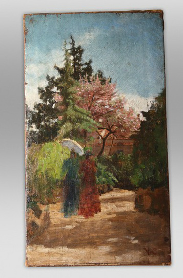 Vincenzo Cabianca (Verona, 1827 - Roma, 1902) Figure in giardino Olio su tela, cm. 29,5 X 16,8 Siglato in basso a destra.