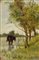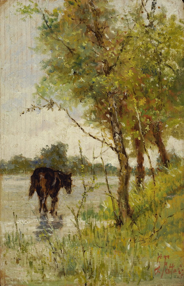 Giovanni Fattori (Livorno, 1825 - Firenze, 1908) Paesaggio con cavallo Olio su tavoletta, cm. 17,7x17,2 Firma in basso a destra. Sul verso, ad inchiostro scuro, di mano dell'Autore: "Ai Cari Amici [...] / [...] l'Amico GFattori".