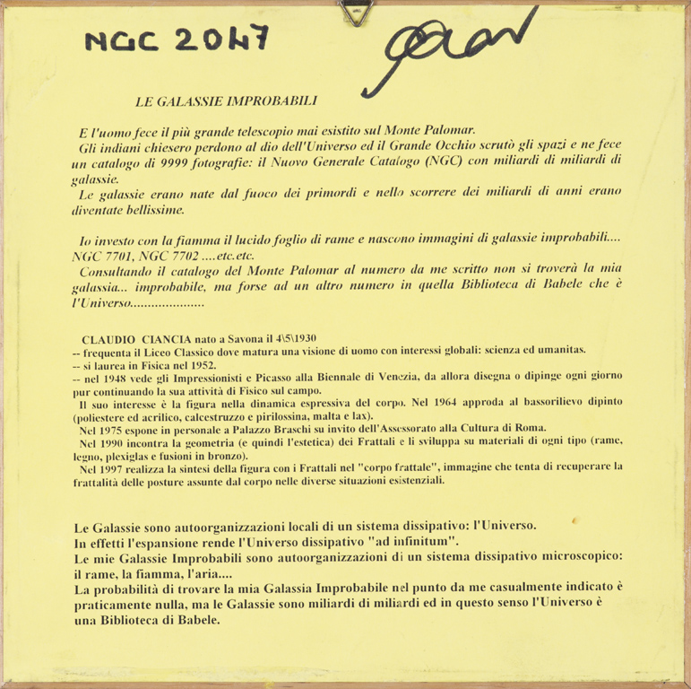 CLAUDIO CIANCIA (1930)Le galassie improbabiliBruciature su ramecm 20x20Firma...
