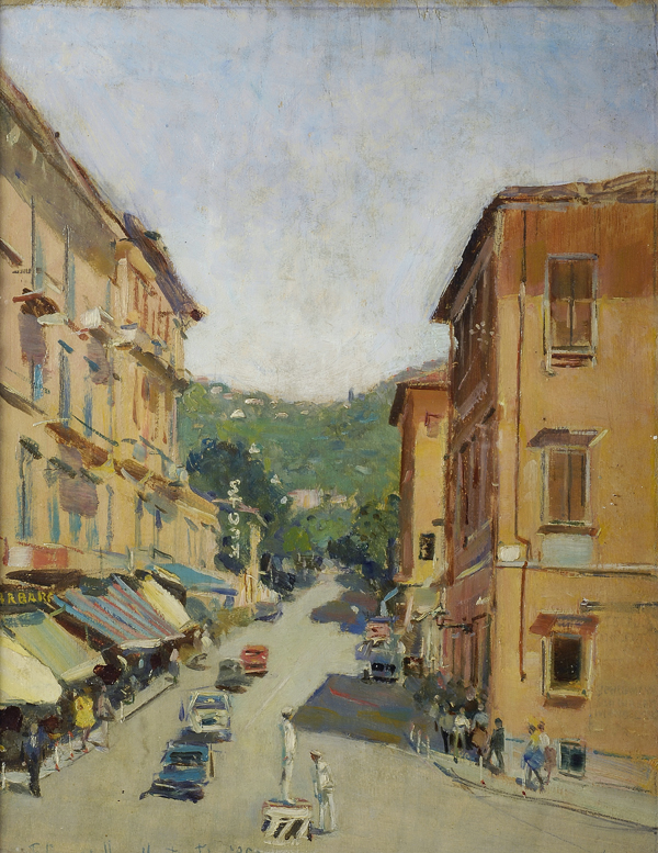 Francesco Cangiullo (Napoli, 1884 - Livorno, 1977) Montecatini: Viale Giuseppe Verdi, 1960 Olio su tavola, cm. 26x20 Firma e data in basso a destra.