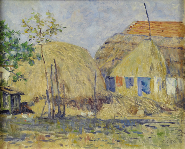 Galileo Chini (Firenze, 1873 - 1956) Campagna di versilia presso il Lido di Camaiore Olio su compensato, cm. 32,5x40,2 Firma in basso a destra. Sul verso: firma e titolo.
