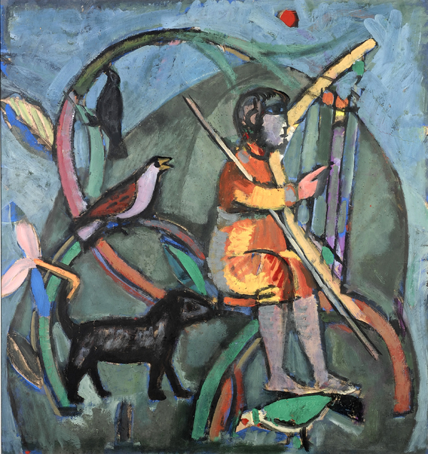 Carlo Mattioli (Modena, 1911 - Parma, 1994) Scena pastorale (pastore con cetra), (1956) Tempera su carta, cm. 83x80 Firma e data in basso a destra. Cartone per la decorazione musiva del paliotto dell'Altare Maggiore della chiesa di Santa Maria della Pace a Parma. Dichiarazione di autenticità su lettera a firma Giuseppe Ventura. Autentica dell'autore su foto.