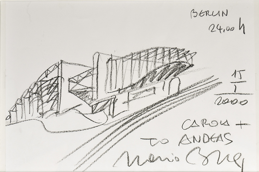Mario Botta (Mendrisio 1943) Bozzetto del museo a Basilea, 2000;Gessetti neri, 28,5 x 41,7 cm, in cornice