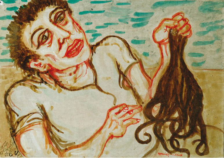 Giuseppe Migneco (Messina, 1908 - Milano, 1997) Pescatore di polipi (anni '80) China colorata su carta riportata su tela, cm 30x42,5 Firma in basso a destra. Certificato Catalogo Generale Giuseppe Migneco. Bibliografia: Migneco, Catalogo Generale, Bonaparte Editrice, Milano 1990, vol. II, pag. 331, tav. 4.