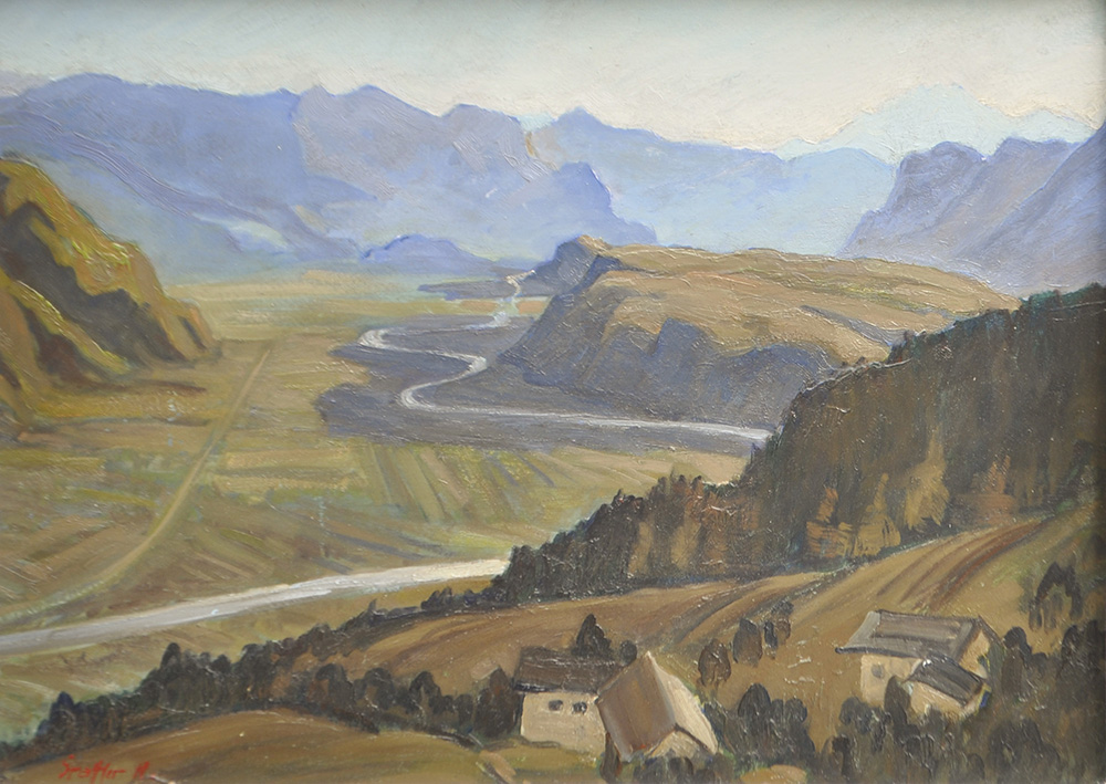Hans Staffler (* Bozen/Bolzano 1903) Das Etschtal von Glaning aus;Öl auf Karton, 35 x 48 cm, gerahmt