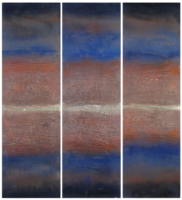 Shuhei Matsuyama (Tokyo, 1955) Shin-on (trittico) Tecnica mista su tavola, cm. 100x30 (ciascuno) Sul verso: firma, titolo e numero di repertorio: n. 00154; timbro StarArteGallery