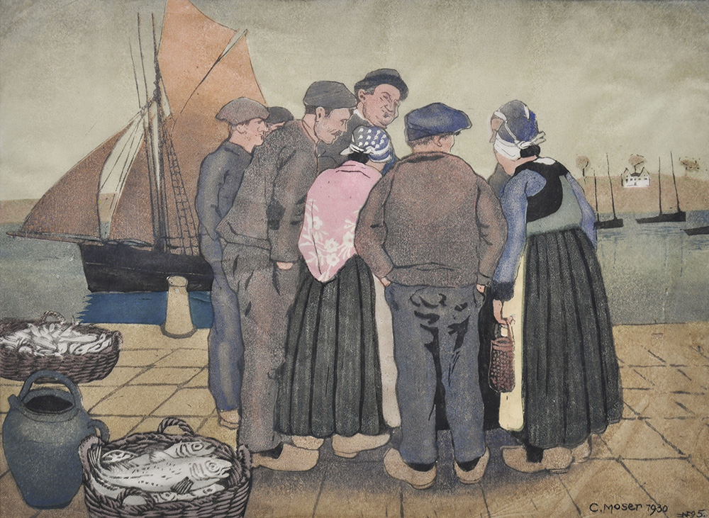 Carl Moser Szene am Hafen, Bretagne, 1930;Farbholzschnitt, 42,8 x 58 cm, kleine restaurierte Einrisse und Fehlstellen,