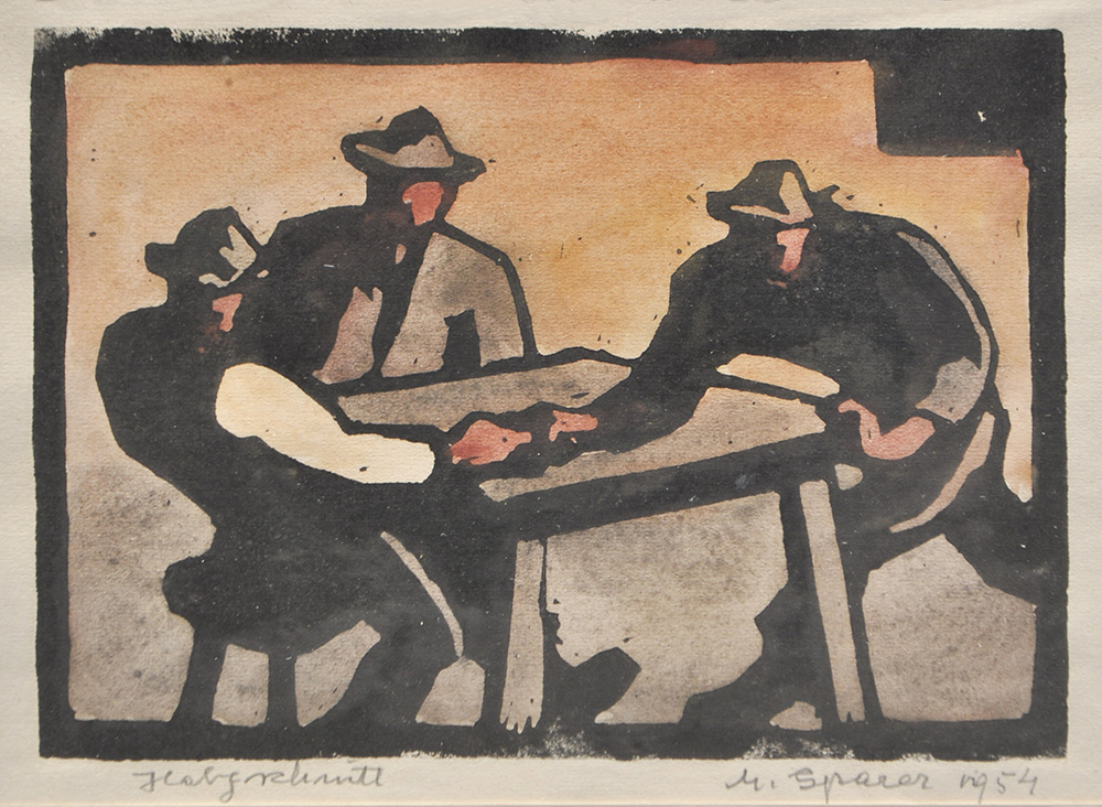 Max Sparer Bauern beim Ranggeln, 1954;Aquarellierter Holzschnitt, 12,5 x 18 cm, gerahmt