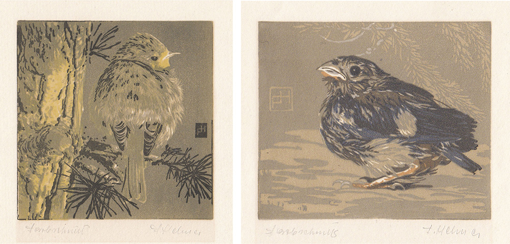 Franz Helmer Spatz im Geäst / Spatz am Boden;2 Farbholzschnitte, 11 x 11 cm, 8,2 x 9,5 cm (Bildfelder)