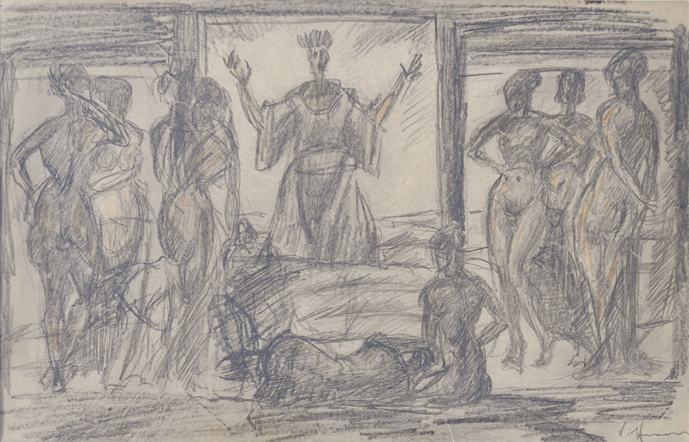 Hans Piffrader (Klausen 1888 – Bozen 1950) Versuchung des hl. Antonius;Schwarze und farbige Kreide, 18 x 27,5 cm, kleiner seitlicher Einriss,