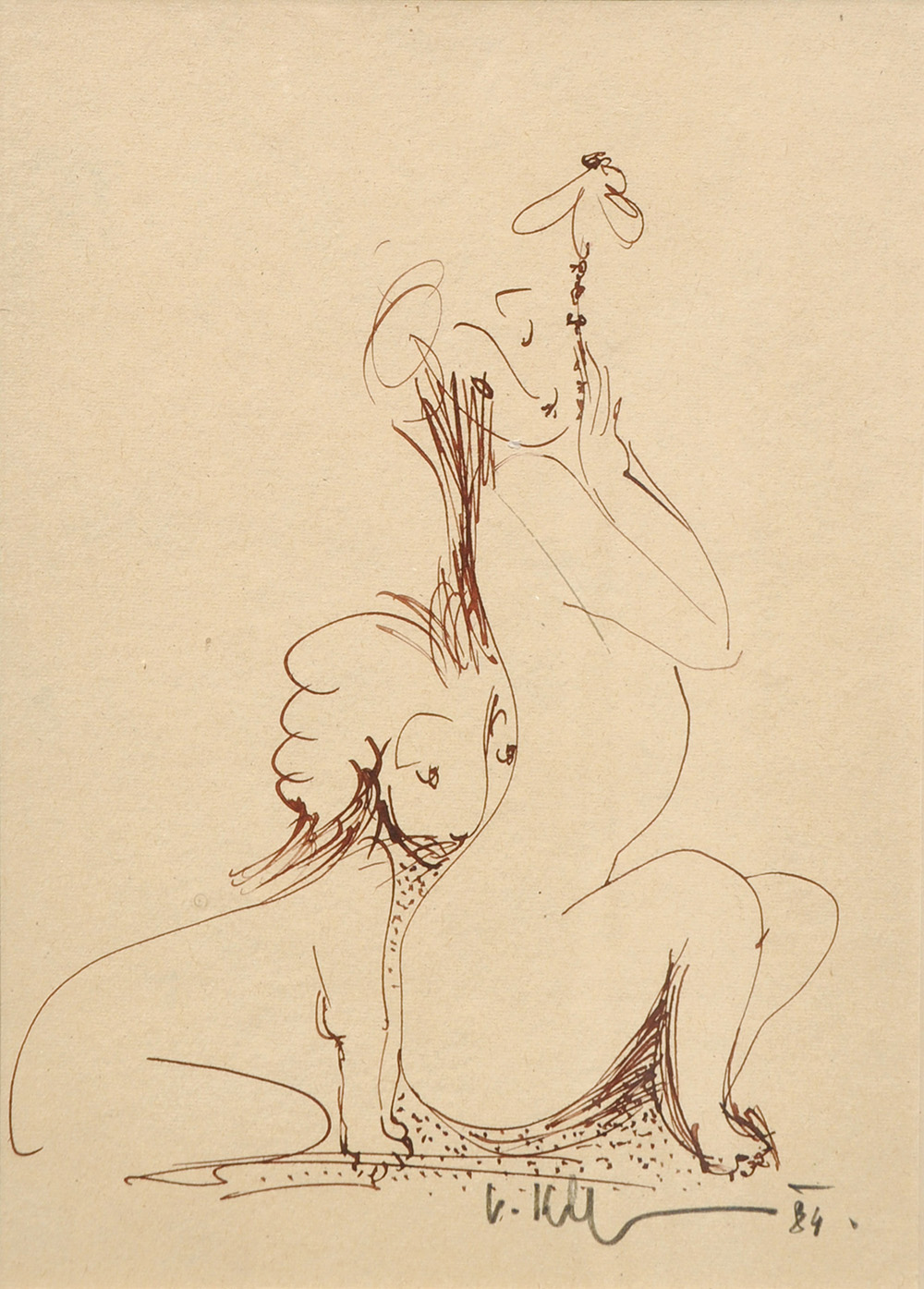 Vladislav Kavan Löwe mit Frau, 1984;Tusche, 22,5 x 15,5 cm, gerahmt