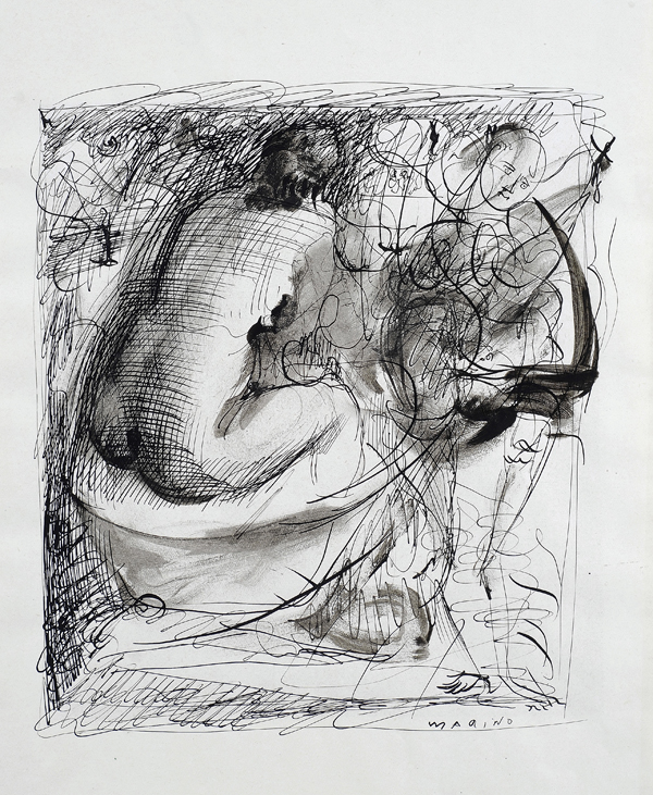 Marino Marini (Pistoia, 1901 - Viareggio, 1980) Nudo e figura China e china acquerellata su carta, cm. 32x22 Firma in basso a destra. Sul verso, nel cartone di chiusura: etichetta Galleria "Genova", Genova.
