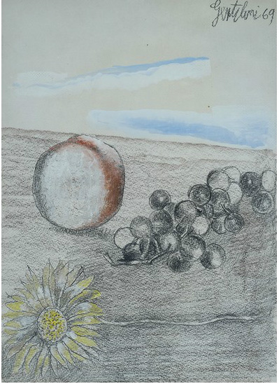 Franco Gentilini (Faenza, 1909 - Roma, 1981) Frutta e girasole, 1969 Tecnica mista su carta riportata su tela, cm. 32x23 Firma e data in alto a destra.