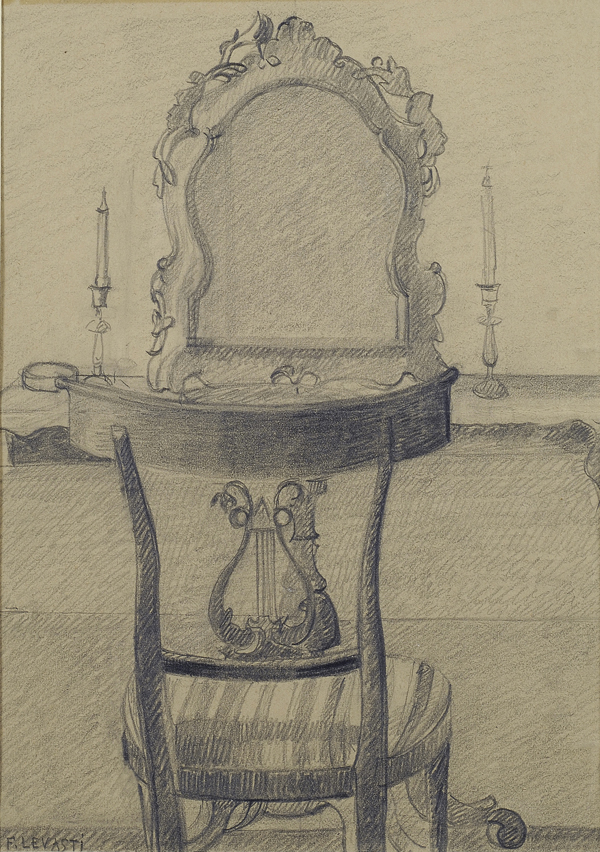 Fillide Levasti (Firenze, 1883 - 1966) Sedia e specchio Matita su carta, cm. 25x18 Firma in basso a sinistra.