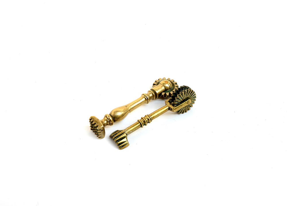 Lotto composto da due rondelle da pasta in ottone con doppia rotella e stampo...