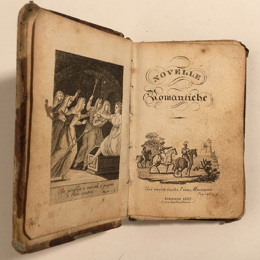 Novelle Romantiche. Firenze: Gaetano Ducci, 1836. Vol. in 32mo (difetti). Legatura coeva in mezza pergamena (difetti).