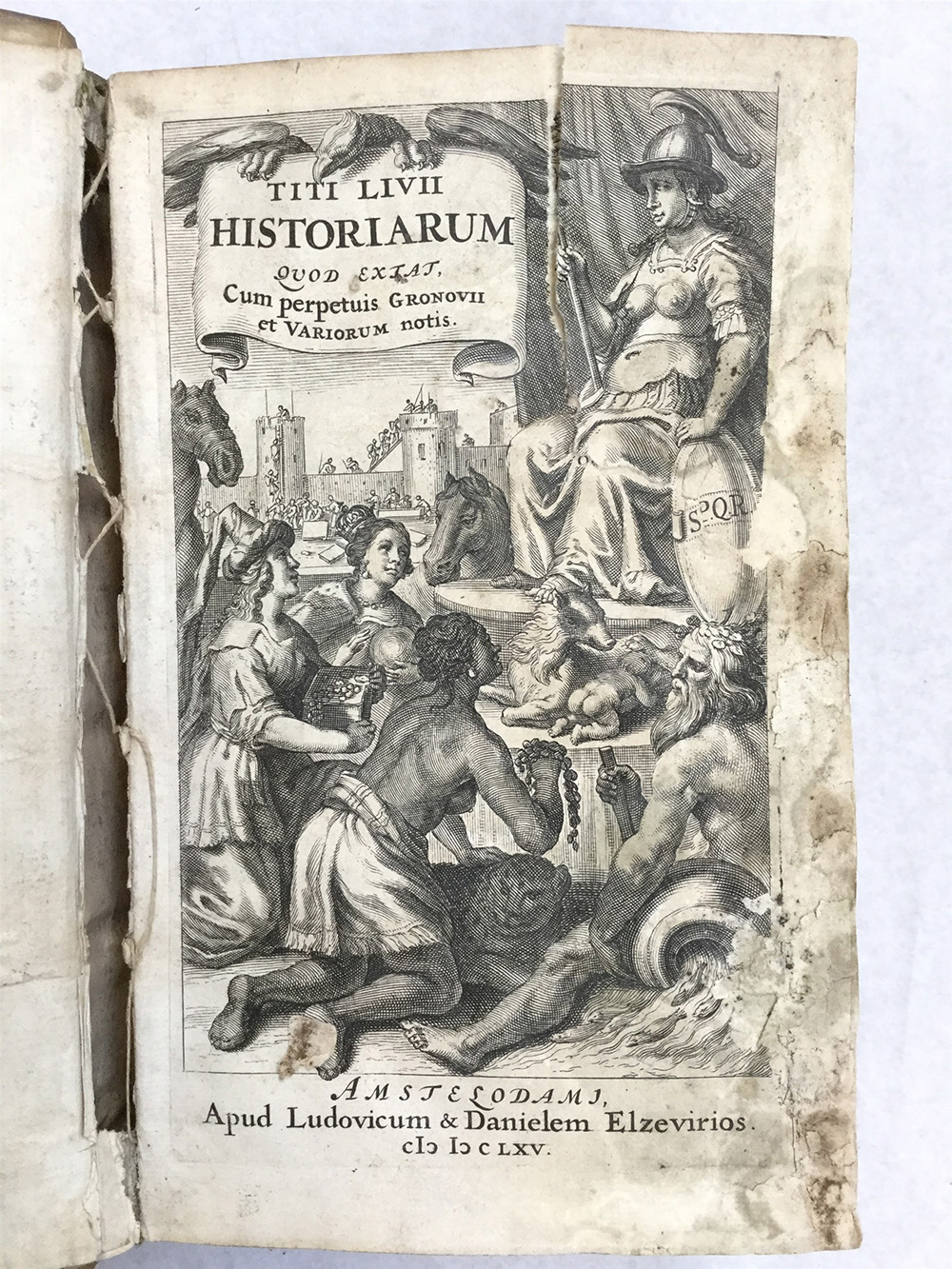 TITO LIVIO - Historiarum quod extat. Amsterdam: Ludovico e Daniele Elzeviro, 1664-65. Tre voll. in 8vo, con bella incisione al freontespizio (purtroppo rovinata). Legatura coeva in piena pergamena (tracce di muffa).