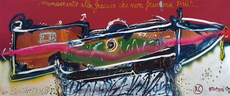 MATTIA MORENI Pavia 12/11/1920 - Brisighella 1999 - Monumento alla freccia che non freccerà più, 1991, colori su tela cm. 70x170, firma e anno in basso a destra, titolo in alto a sinistra, titolo, firma e anno al retro, dichiarazione d'autenticità dell'artista su foto, pubblicato sul Catalogo "Moreni Il Regressivo 1983-?" Giorgio Mondadori & Associati alla pagina 44.