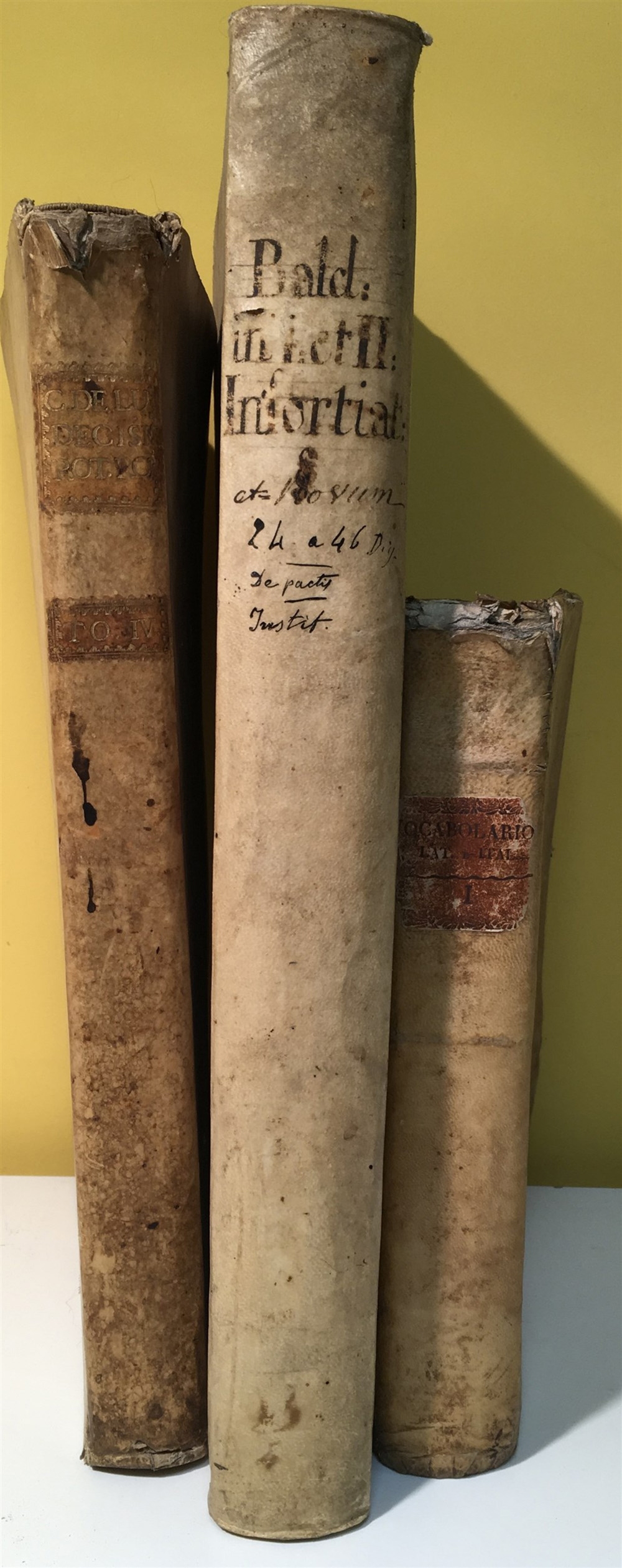 Lotto composto da un vocabolario latino-italiano (Torino, 1818), da un'opera concernente le decisioni della Sacra Rota (Napoli, 1758) e da un'opera di soggetto giuridico (Venezia, 1586). Legature differenti (difetti).