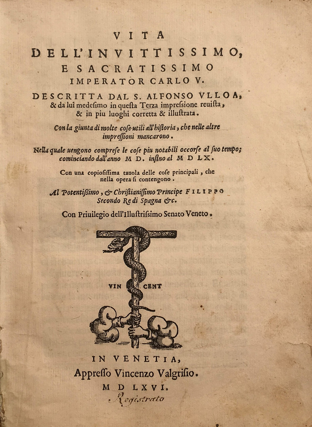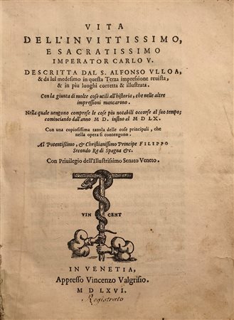 ULLOA, Alfonso de - Vita dell'Invitissimo e Sacratissimo Imperator Carlo V. Venezia: Vincenzo Valgrisi, 1566. Vol. in 8vo, marca tipografica al frontespizio, iniziali e fregi xilografici, testo in corsivo (difetti). Pergamena posteriore (difetti).