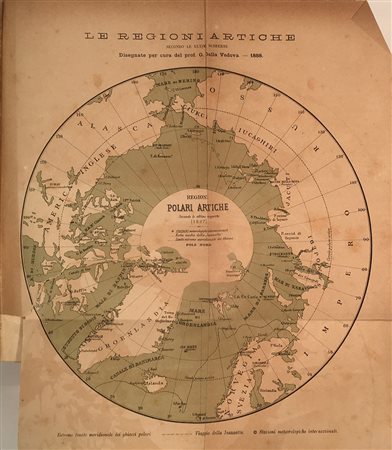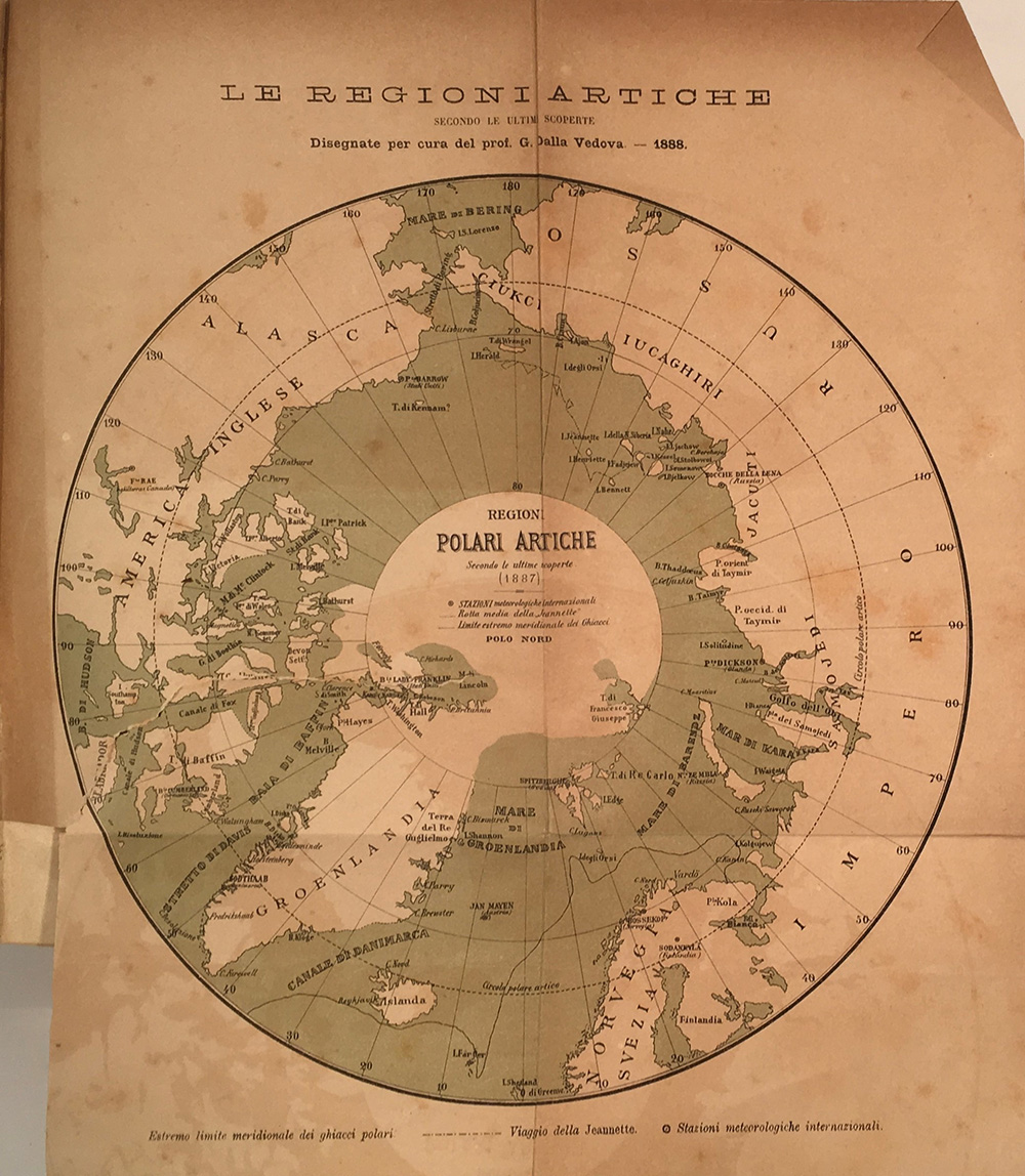 DALLA VEDOVA, Giuseppe (pref. di) - In mezzo ai ghiacci. Milano: Treves, 1888. In 4to, illustrato con incisioni e una carta delle regioni polari (difetti, un po’ brunito). Cartone marmorizzato verde, dorso petrolio stampato in oro (difetti).