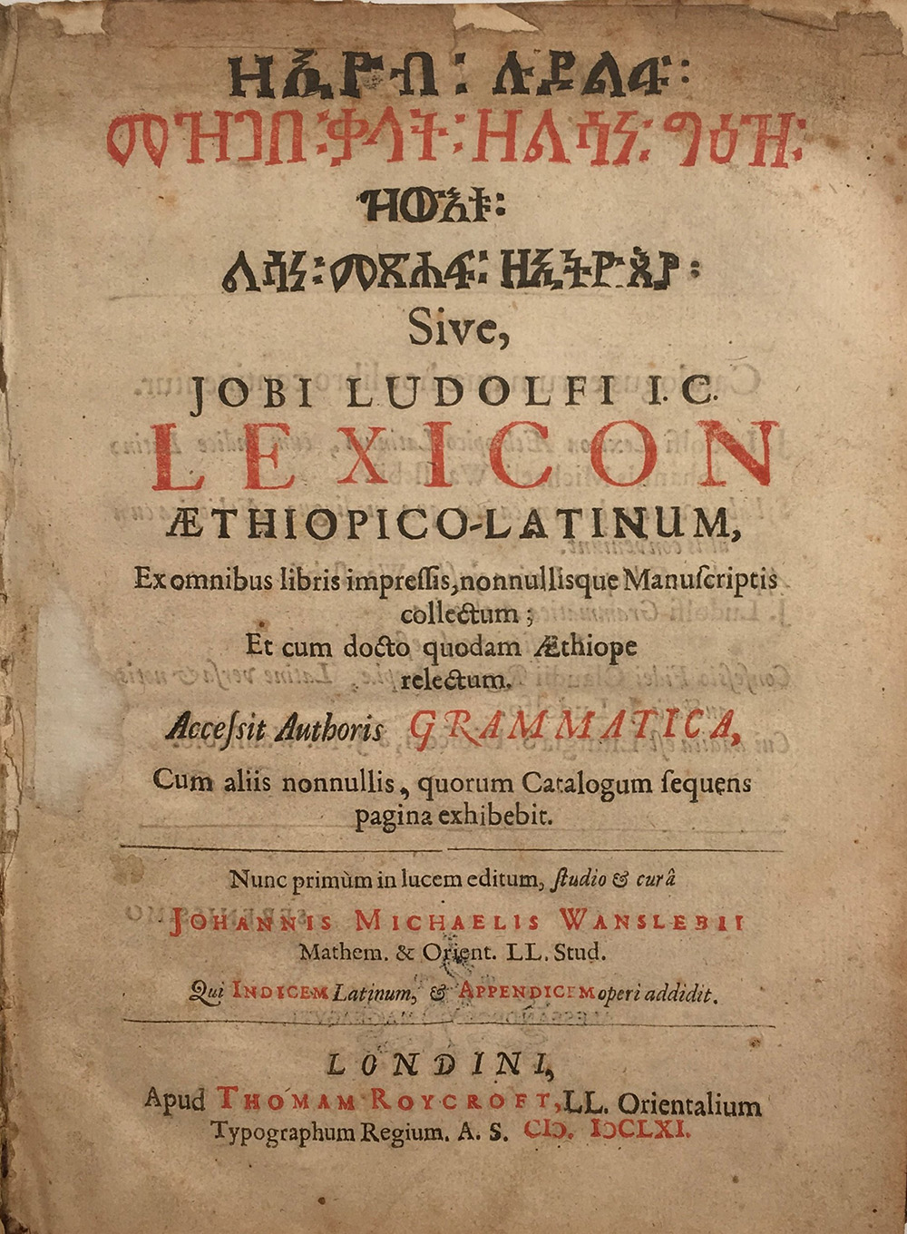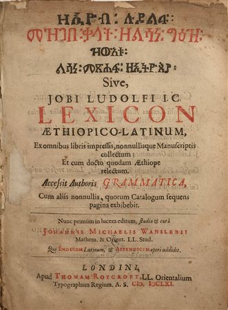 LUDOLF, Hiob - Lexicon Aethiopico-Latinum ex omnibus libris impressis. Londra: Thomam Roycroft, 1661. Vol. in 4to, con frontespizio in nero e rosso, testo in latino ed etiope (restauri, fioriture, bruniture). Legatura in piena pelle con stemma in oro ai piatti (difetti).