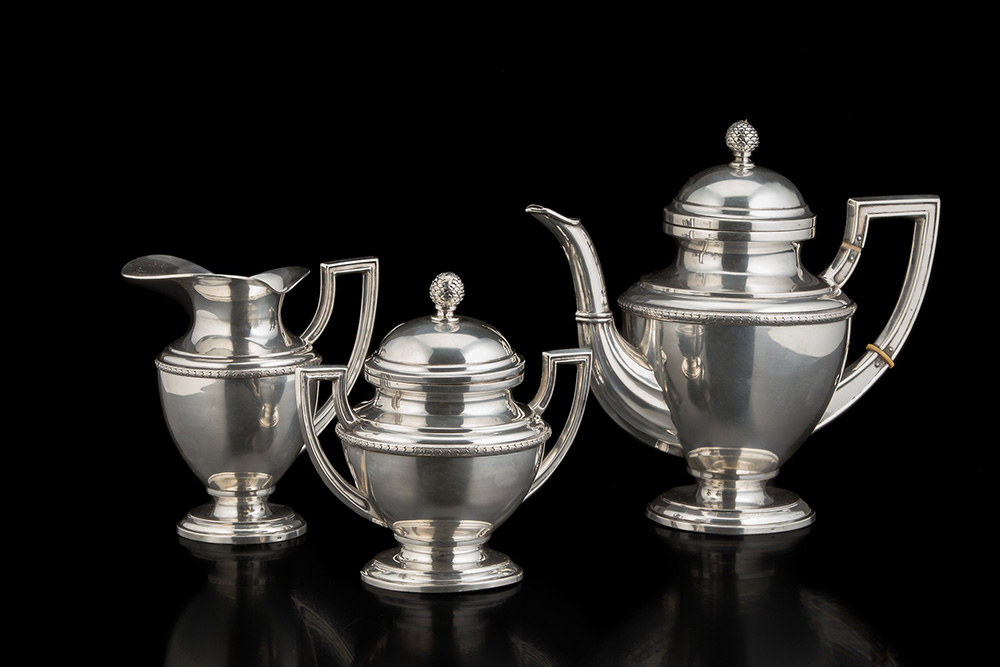 Servizio da tè in argento composto da teiera, zuccheriera e lattiera, con corpi a balaustro gradinato, con superficie liscia decorata da cintura modanata con foglie d'alloro; manici ad ansa squadrata, cimatura a pigna. Italia, metà secolo XX (h. max cm 22 ca.) (g tot 890 ca.) (lievi difetti)