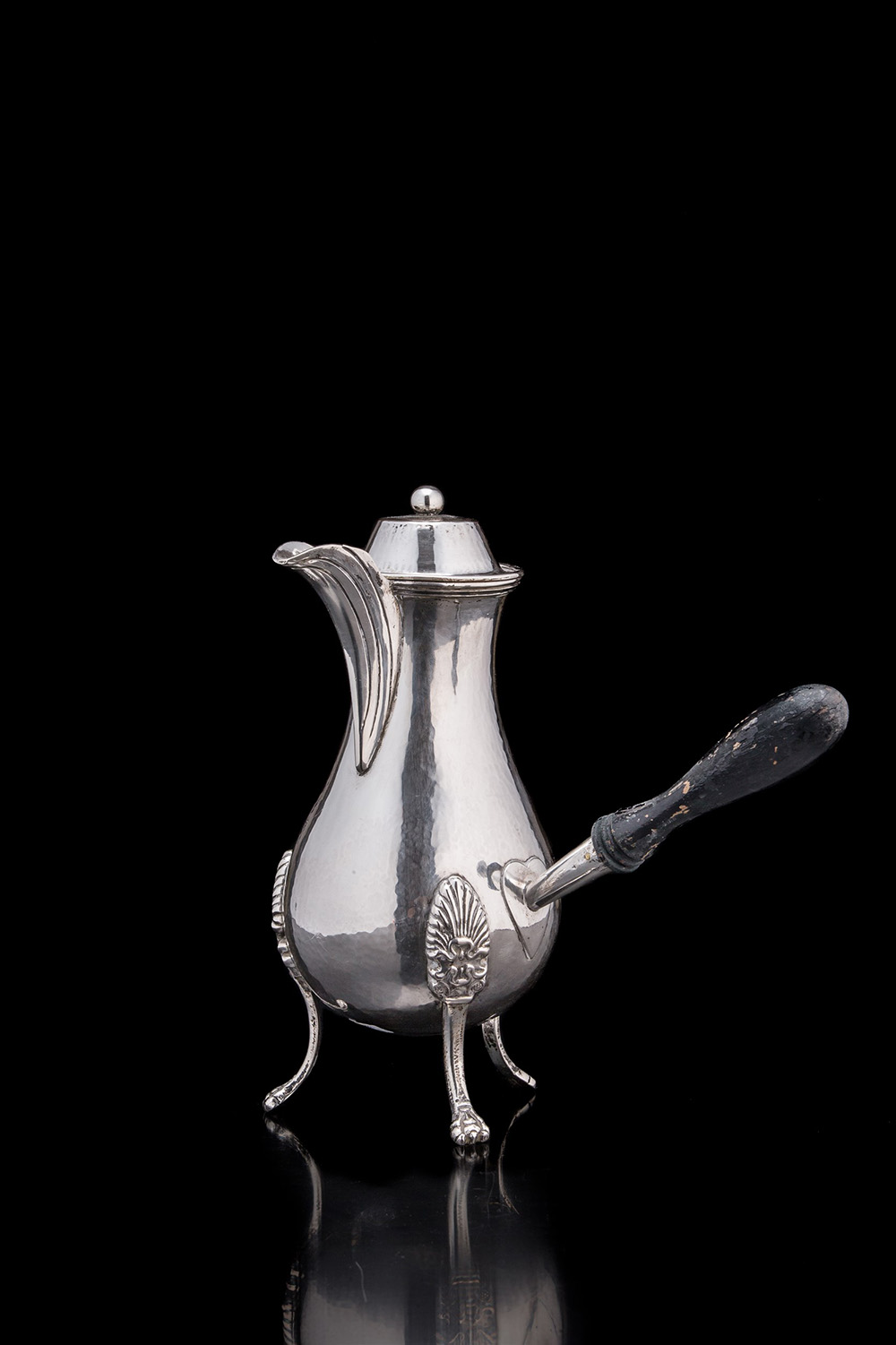 Caffettiera tripode in argento con corpo piriforme liscio, piedini ad artiglio e manico radiale in legno; Hanau (?), secolo XIX-XX (h. max cm 22,5 ca.) (g lordi 580 ca.) (lievi difetti)