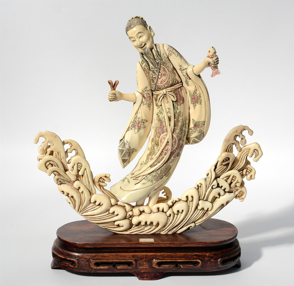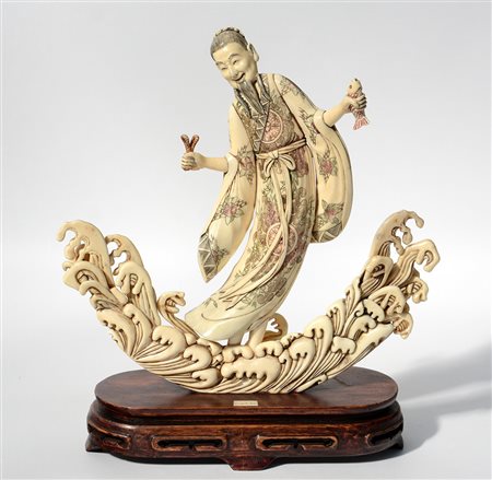 Scultura in avorio di figura leggendaria su onde con base in legno (h. 31 cm.) (difetti)Cina, sec. XX