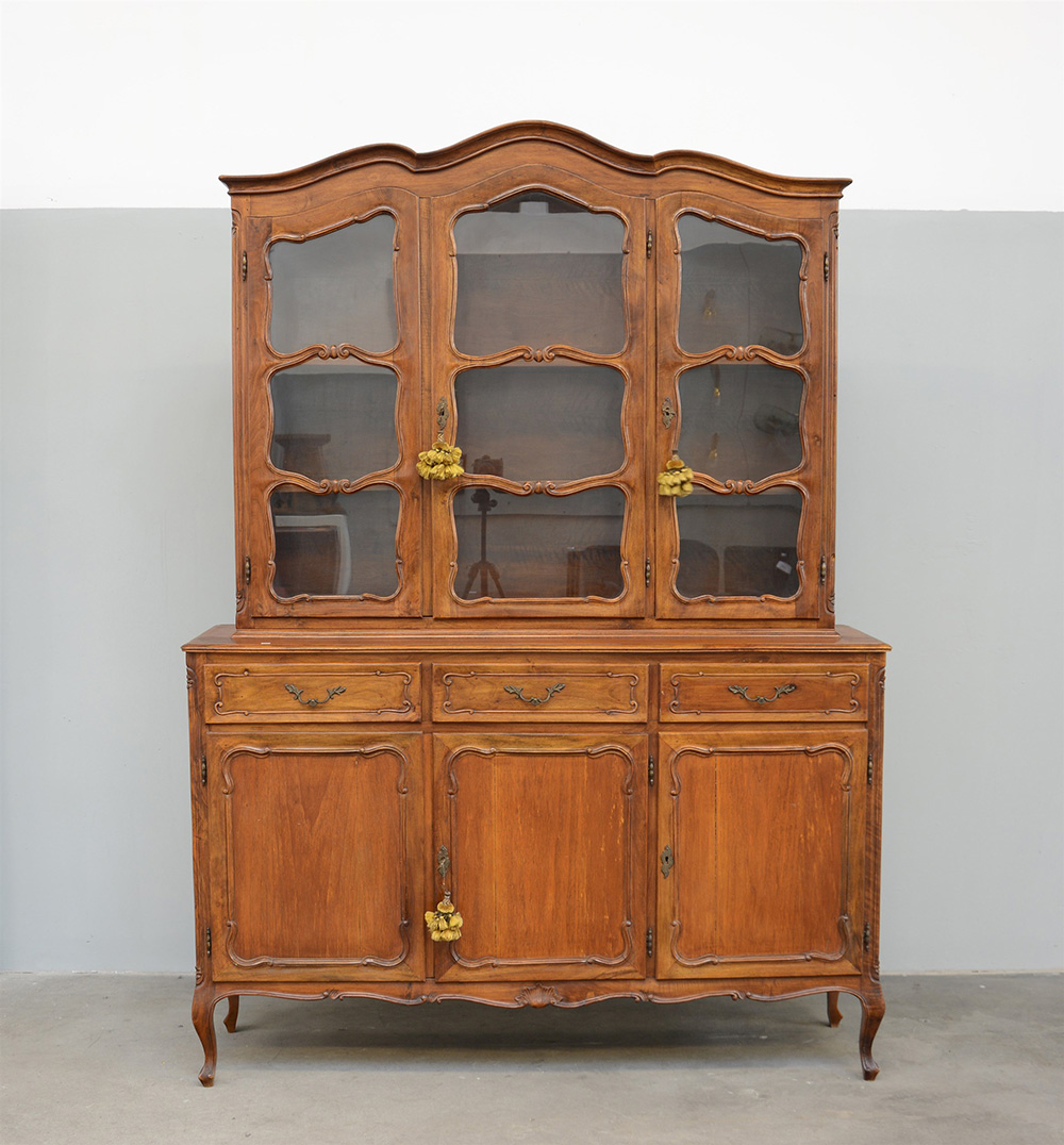 Credenza a due corpi con parte superiore a tre ante a vetro, parte inferiore a tre cassetti e tra ante riquadrate (cm 153x215x44) (difetti)